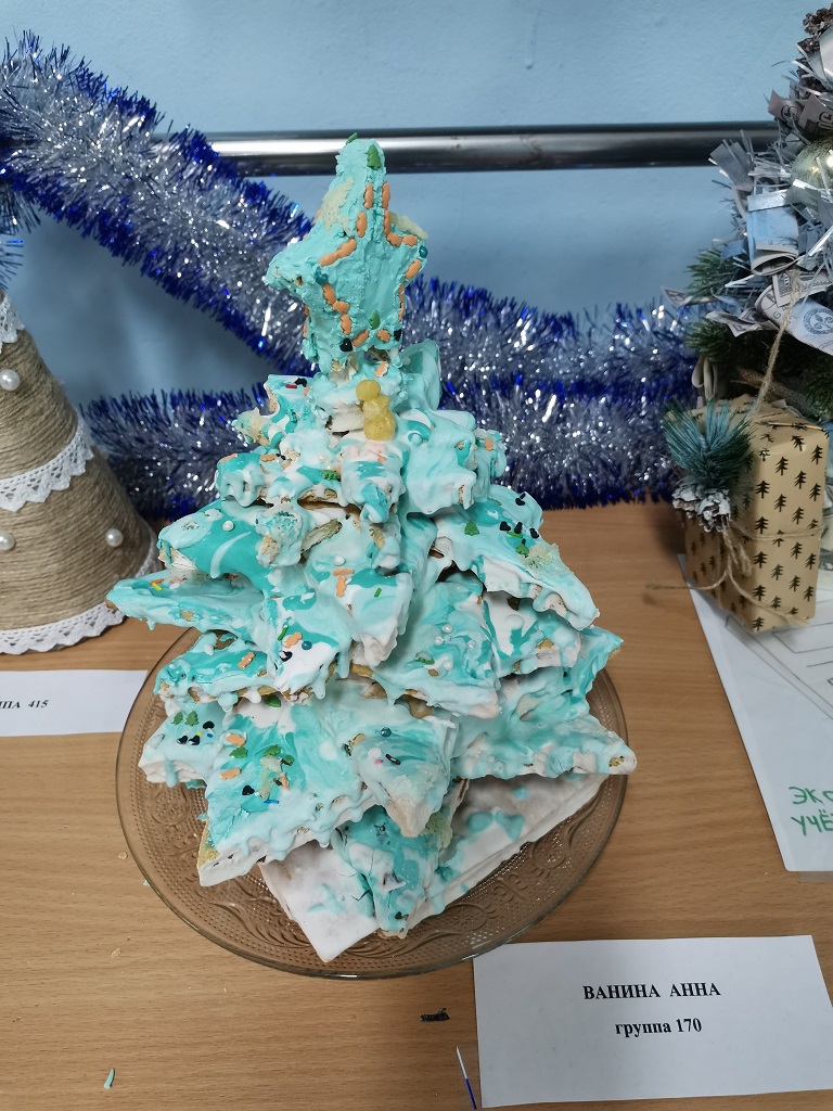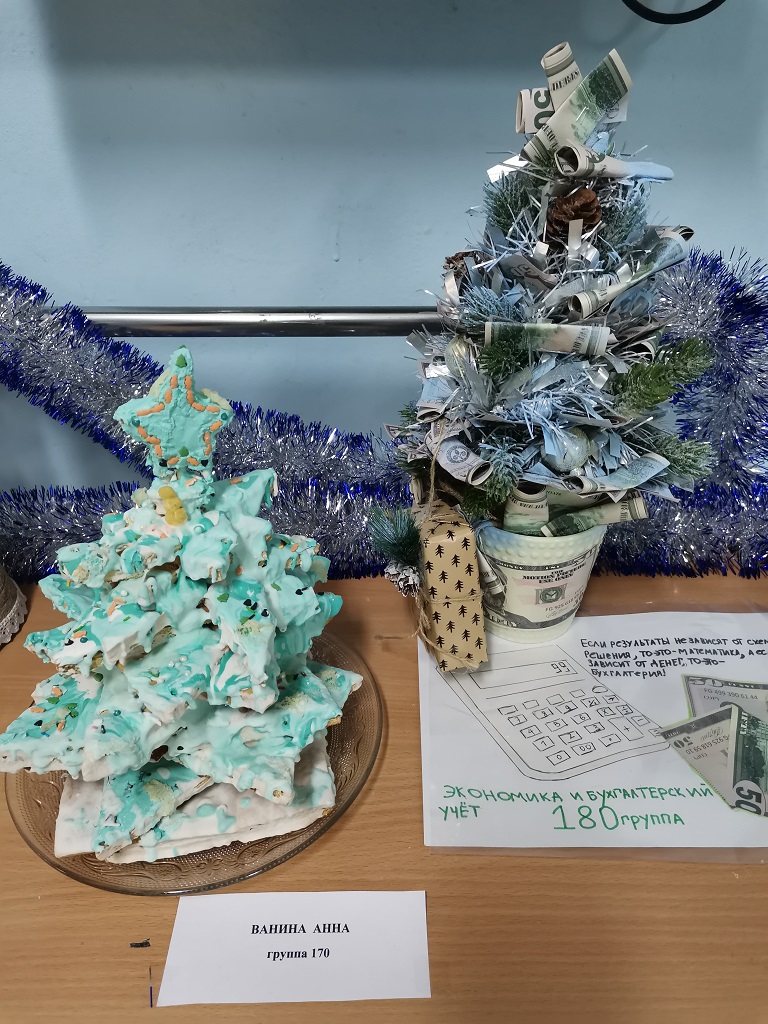 Сертификатами участия и сладкими призами были отмечены 3 работы студентов группы №161/2, ёлочка, которую представила на конкурс главный бухгалтер колледжа Ананьина Е.Е. и работа студентов группы №415.
