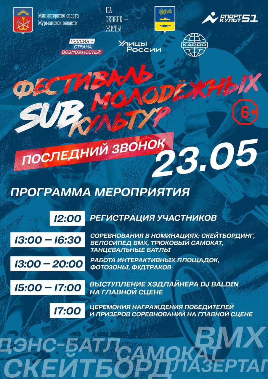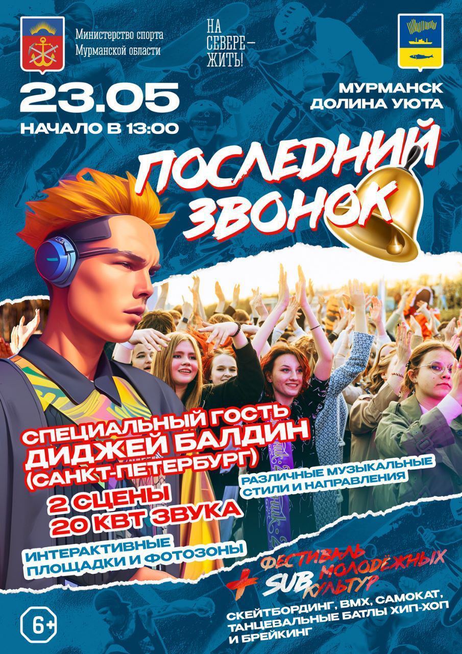 "Последний звонок" состоится в Мурманске 23 мая. Второй год подряд для юных северян организуют насыщенную программу в Долине Уюта. В этом году Фестиваль молодёжных субкультур, приуроченный к празднованию "Последнего звонка", дополнит яркая музыкальная программа