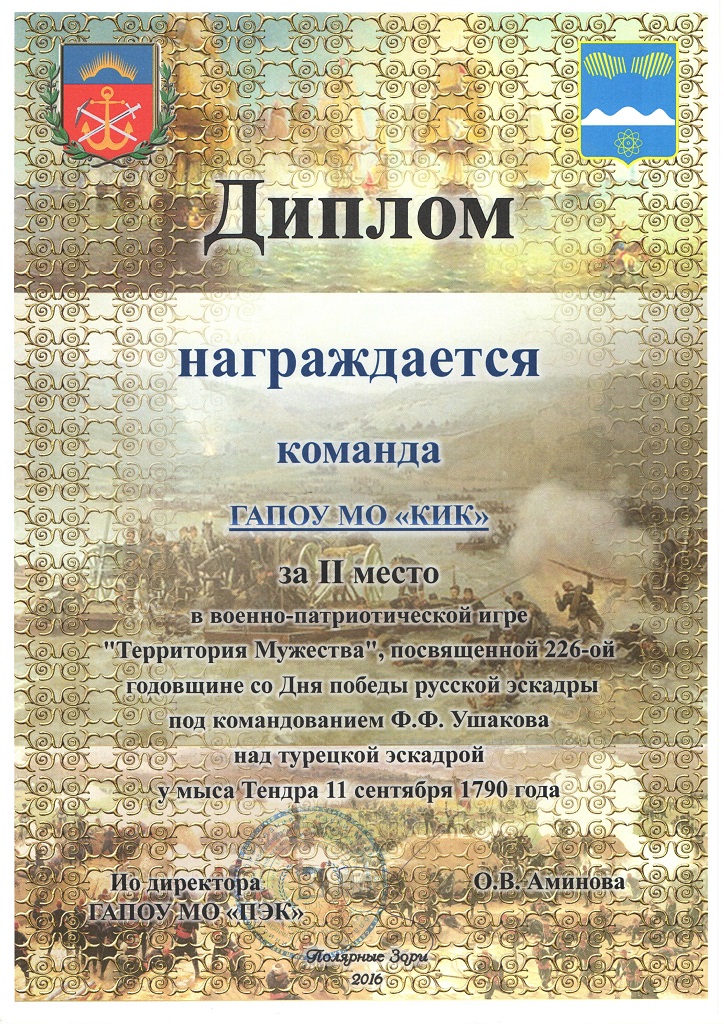 9 сентября 2016 года в «Полярнозоринском энергетическом колледже» состоялась третья военно - патриотическая игра «Территория мужества», посвящённая 226-ой годовщине со Дня победы русской эскадры под командованием Ф.Ф.Ушакова над турецкой эскадрой у мыса Тендра 11 сентября 1790 года.