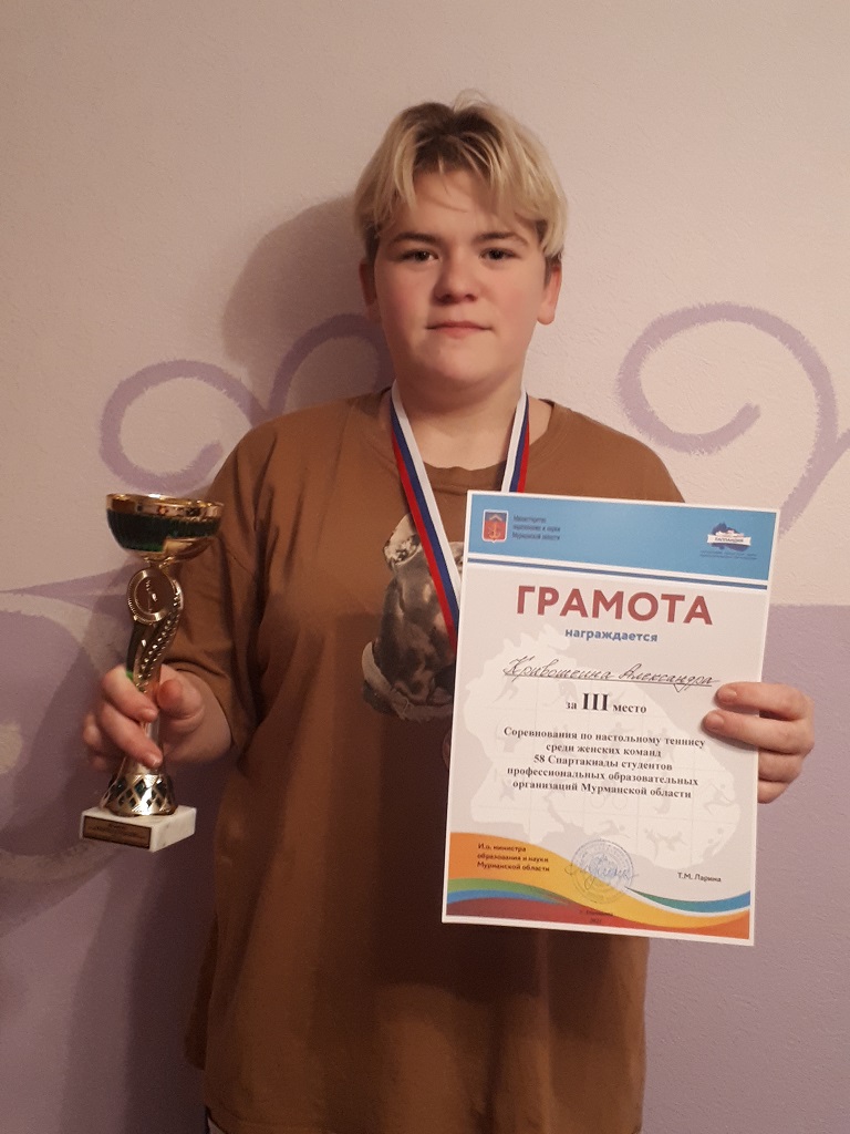 В упорной борьбе наша теннисистка Кривошеева Александра сумела занять третье место в личном командном зачете. Александра была награждена кубком, медалью и грамотой Министерства образования и науки Мурманской области.