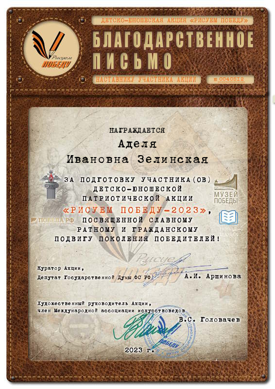 В этом году студенты колледжа Мардарь Дарья, Мельникова Татьяна, Красин Итан, под руководством педагога дополнительного образования Зелинской А.И. приняли участие в патриотической акции «Рисуем Победу-2023», посвященной славному ратному и гражданскому подвигу поколения победителей.