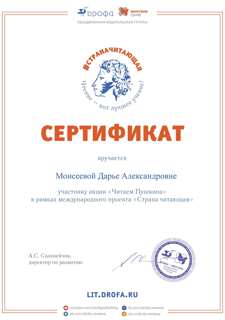 Студенты молодежного объединения «Творческая мастерская», под руководством библиотекаря Тришиной Ольги Александровны и воспитателя общежития Солодовой Натальи Павловны : Башко Ксения Андреевна; Моисеева Дарья Александровна; Филиппов Андрей Эдуардович; Чистякова Лидия Владимировна получили сертификаты участников акции «Читаем Пушкина» в рамках международного проекта «Страна читающая».