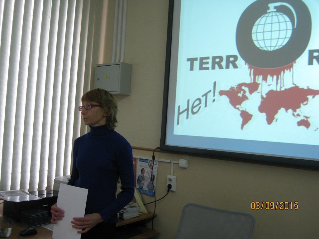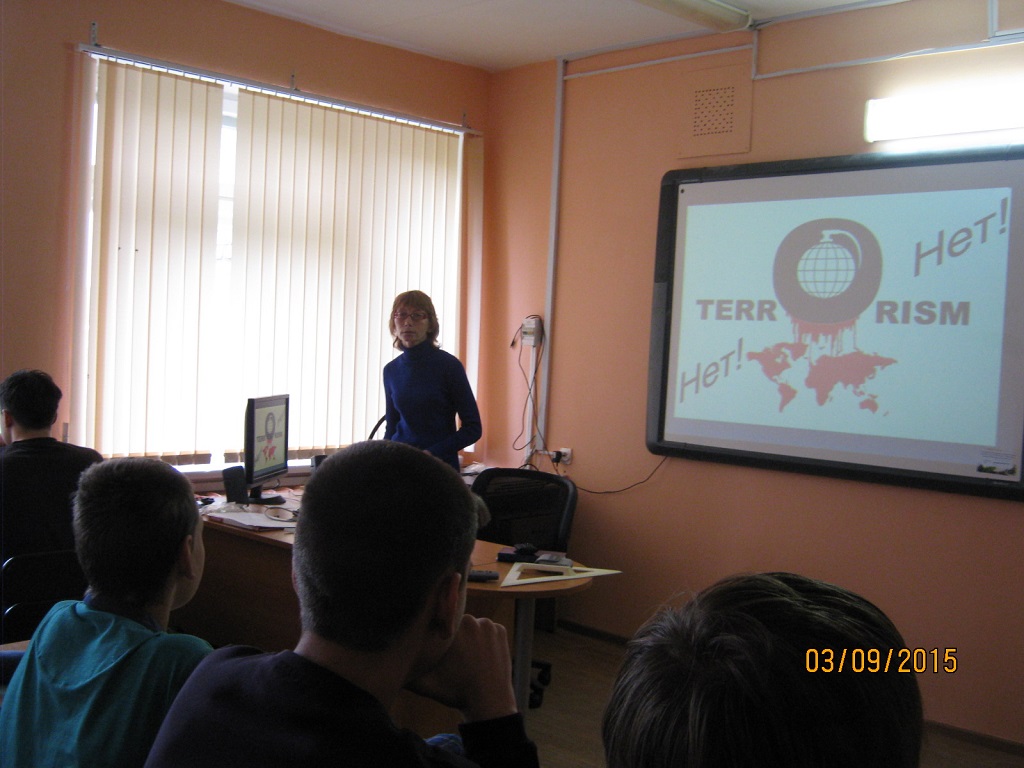 Ежегодно 3 сентября в нашей стране отмечается особая дата - День солидарности в борьбе с терроризмом. Россияне с горечью вспоминают людей, погибших от рук террористов, а так же тех сотрудников правоохранительных органов, которые погибли во время выполнения служебного долга. «ТЕРРОРИЗМ. НЕТ!» под таким названием прошли классные часы в Кандалакшском индустриальном колледже. В проведении классных часов приняли участие Кирилова Вера Николаевна – заведующая Центром правовой и деловой информации центральной библиотеки и Жаравина Светлана Геннадьевна, инспектор ГДН ОУУП и ПДН МО МВД России «Кандалакшский». Минутой молчания почтили все память погибших от рук террористов.