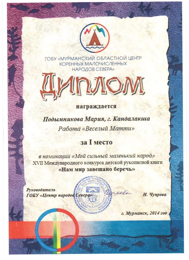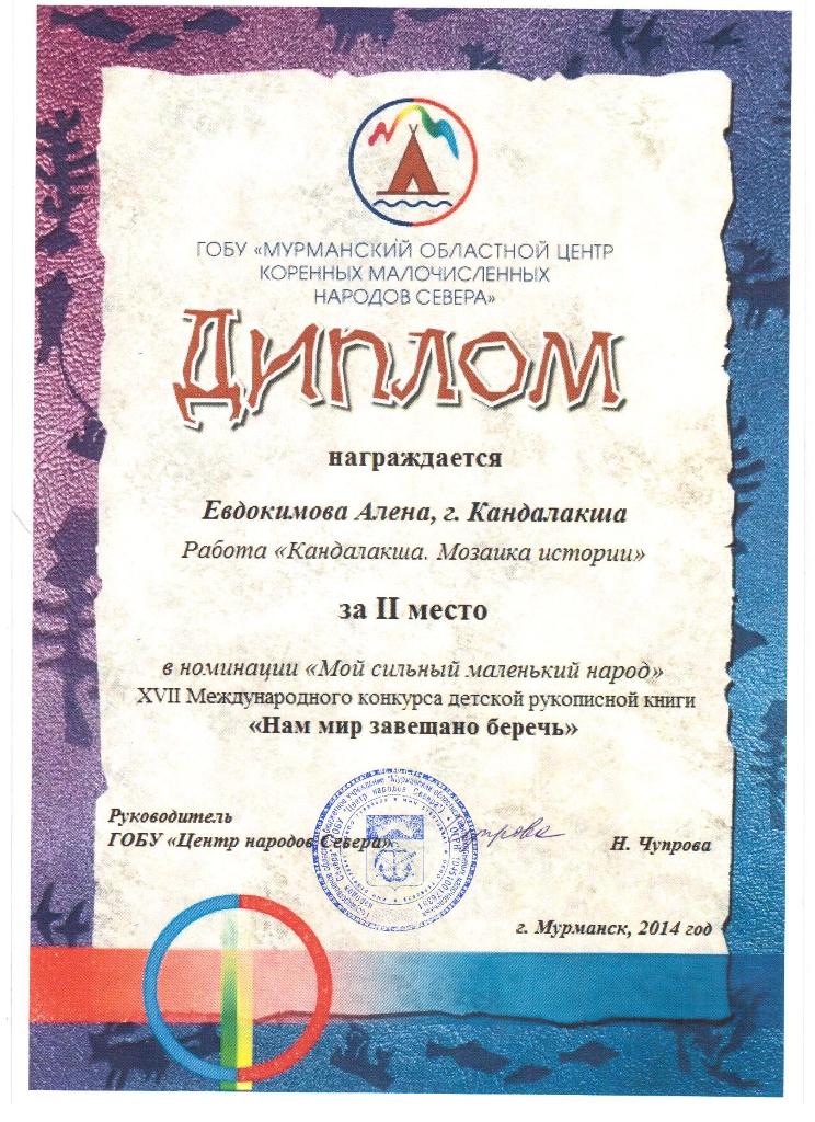 В номинации «Мой сильный маленький народ» лучшими признаны работы студентов Кандалакшского индустриального колледжа Подымниковой Марии (1 место) и Евдокимовой Алены (2 место).