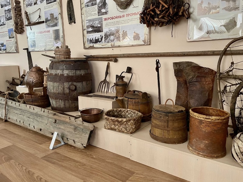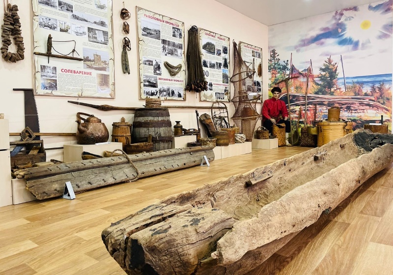 «Экспозиция поморского зала – одна из самых интересных, в ней представлено много уникальных предметов прошлого. Особое место отведено рыбным промыслам. Показан борт шняки, рыболовного судна для трескового лова, его изготовляли с помощью деревянных заклёпок и корней дерева. Рядом - основные приспособления для рыбной ловли: ярус, мерёжа, сеть с берестяными поплавками, грузила геометрической формы. Для засолки рыбы местные бондари с помощью незамысловатых инструментов изготовляли разные по объёму бочки, но особым спросом пользовались бочонки, рассчитанные на ведро беломорской сельди, их так и называли – сельдянки. Для русской бани изготовляли шайки, а для воды – ушаты. Эти предметы, в качестве экспонатов, можно увидеть в экспозиции.