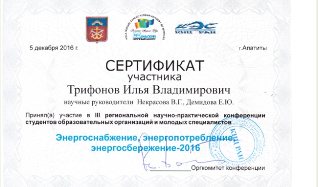 В актовом зале Президиума КНЦ г. Апатиты 5 декабря состоялась III региональная научно – практическая конференция студентов образовательных организаций и молодых специалистов «Энергоснабжение, энергопотребление, энергосбережение - 2016». С темой доклада «Энергосбережение в наших домах» выступил студент 1 курса группы 140 «Электроснабжение (по отраслям)» Трифонов Илья, его руководителем были преподаватели Демидова Елена Юрьевна и Некрасова Вера Геннадьевна.