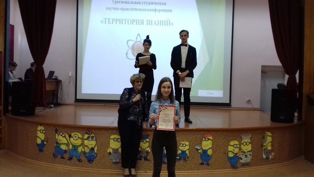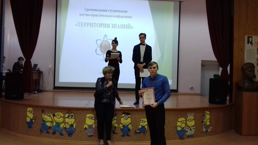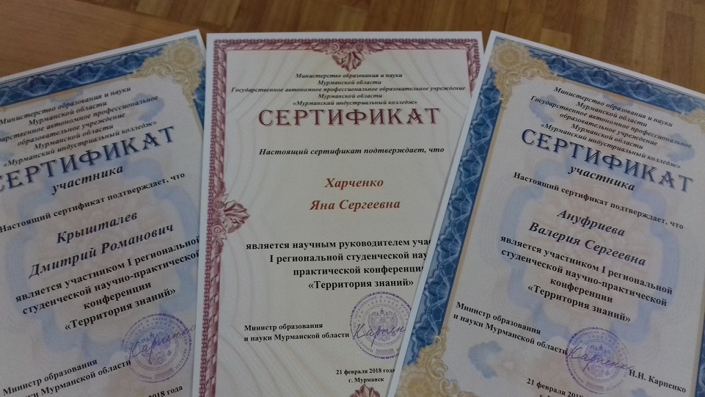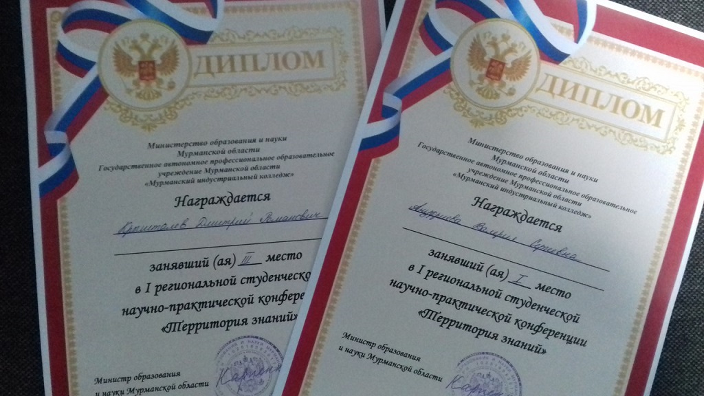 21 февраля 2018 года в ГАПОУ МО «Мурманский индустриальный колледж» состоялась I региональная студенческая научно-практическая конференция «Территория знаний», в которой приняло участие свыше 50 обучающихся образовательных организаций Мурманской области по направлениям: Наше образовательное учреждение представляли студенты Крышталев Дмитрий, Ануфриева Валерия (группа № 320) и Дурягина Елизавета (группа №272) в секциях «Точные науки и информационные технологии в науке и практике» и «Гуманитарные науки в современном социуме и исторические перспективы их развития».