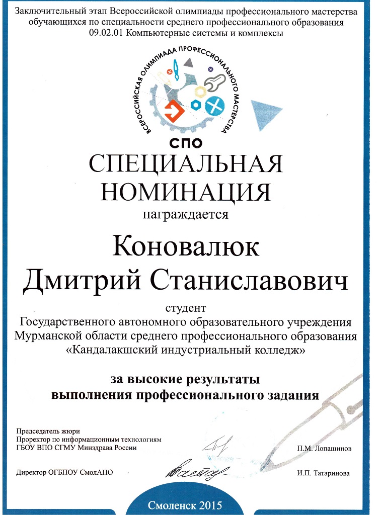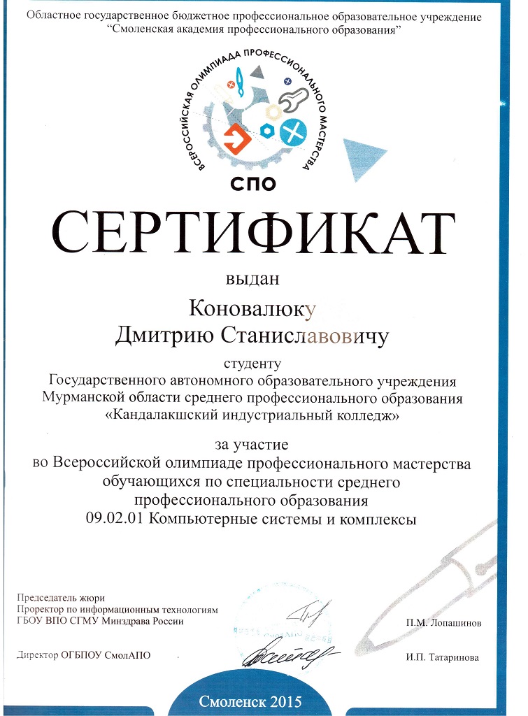 С 8 по 10 апреля 2015 года на базе Смоленской академии профессионального образования в городе Смоленске проводился Заключительный этап Всероссийской олимпиады профессионального мастерства по специальности среднего профессионального образования 09.02.01 «Компьютерные системы и комплексы». Сюда приехало 25 участников – победители региональных олимпиад - представители 5 Федеральных округов из 22 субъектов Российской Федерации: Архангельская область, Брянская область, Владимирская область, Воронежская область, Ивановская область, Калужская область, Краснодарский край, Липецкая область, Московская область, Мурманская область, Нижегородская область, Оренбургская область, Республика Адыгея, Республика Башкортостан, Республика Дагестан, Республика Марий Эл, Республика Удмуртия, Санкт-Петербург, Свердловская область, Тверская область, Тульская область, а также представители Смоленской области вне конкурса.