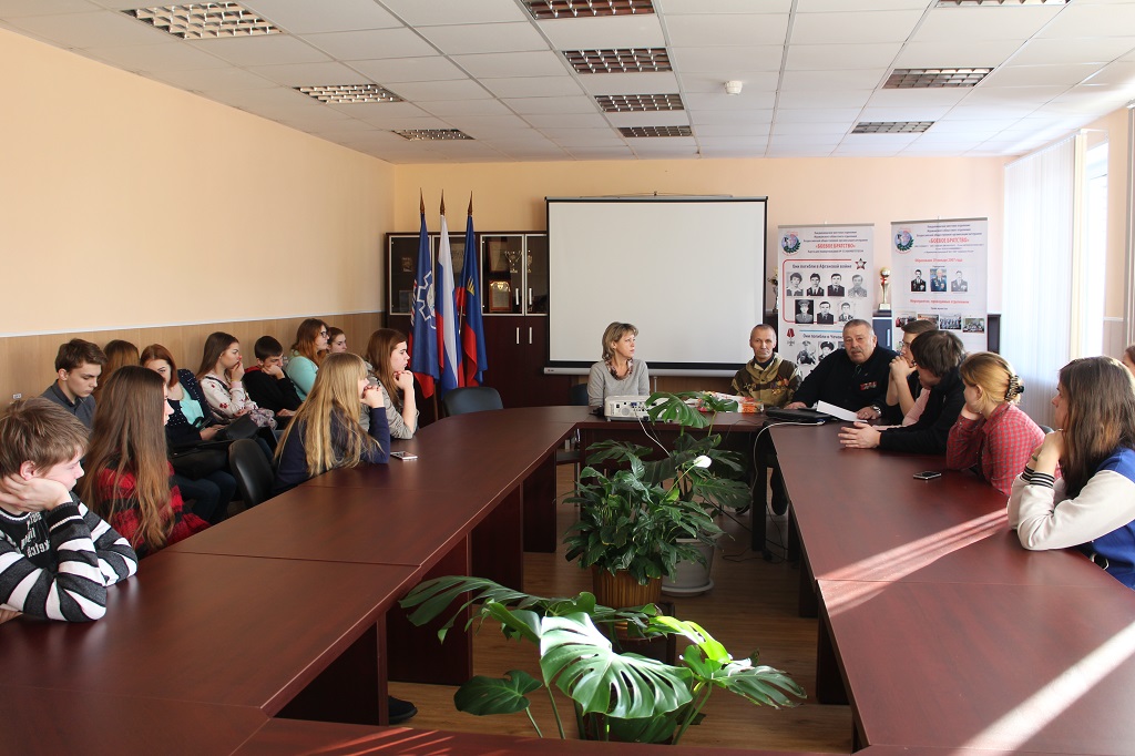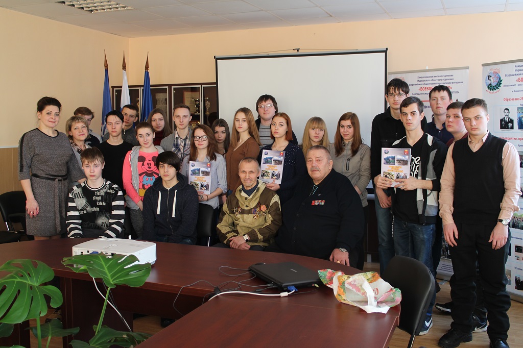 21 февраля 2017г. студенты колледжа собрались на традиционную встречу с участниками локальных войн, в которой приняли участие члены общественной организации «Боевое братство», участник войны в Афганистане, подполковник запаса Яроховец В.В. старший сержант полиции, участник военных действий в Чеченской республике Потапов А.В. и специалист краеведческого отдела центральной библиотеки Зяблов В.В., побывавший в Чечне в качестве фотокорреспондента.