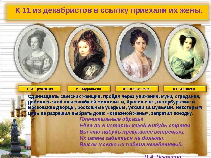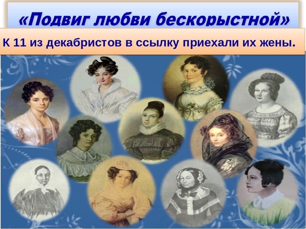 Жёны декабристов показали преданность своим мужьям, лишившимся дворянских титулов и прочих привилегий своего сословия и добровольно отправившихся за своими сосланными мужьями в холодную непроглядную Сибирь.
