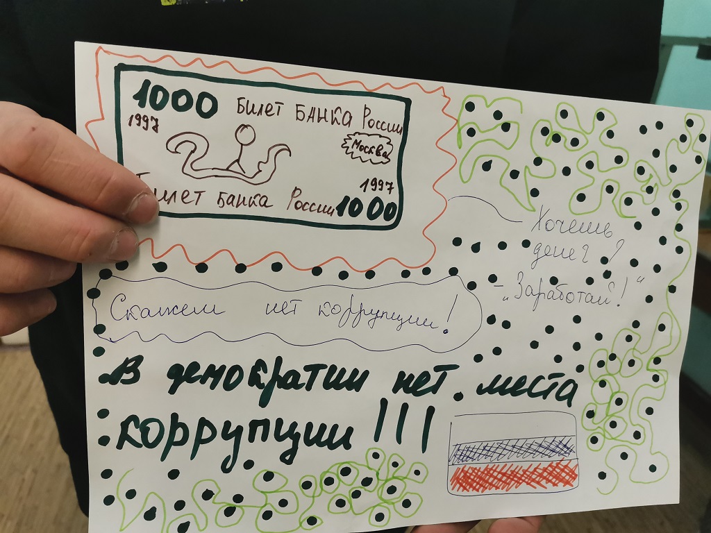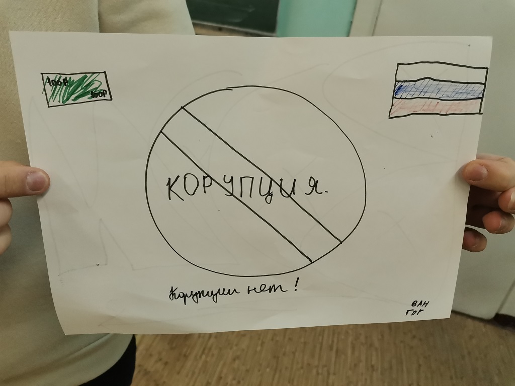 Группа студентов, разделившись на две команды, активно отвечали на вопросы, а в завершение викторины выполнили творческое задание: изобразили на бумаге и представить на суд жюри рекламу «Скажи коррупции нет».
