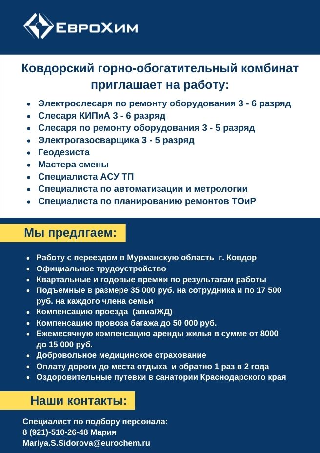 Ковдорский горно-обогатительный комбинат приглашает на работу