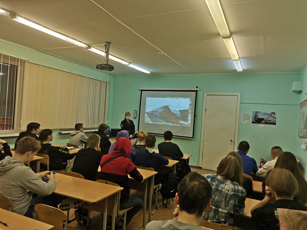 Инспектор по делам несовершеннолетних линейного отдела полиции на ст. Кандалакша Шиговдинова И.В. довела до сведения обучающихся информацию о правонарушениях на объектах железнодорожного транспорта и предусмотренной административной и уголовной ответственности за их совершения.