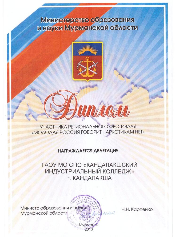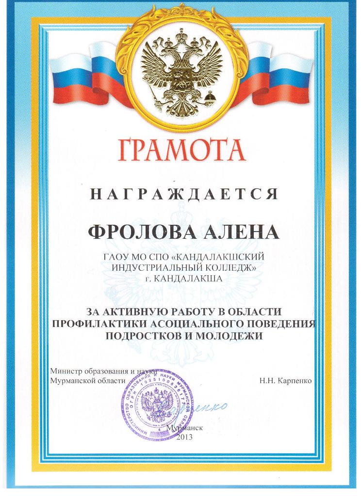 Студентка ФРОЛОВА АЛЁНА награждена грамотой Министерства образования и науки Мурманской области за активную работу в области профилактики асоциального поведения подростков и молодежи.