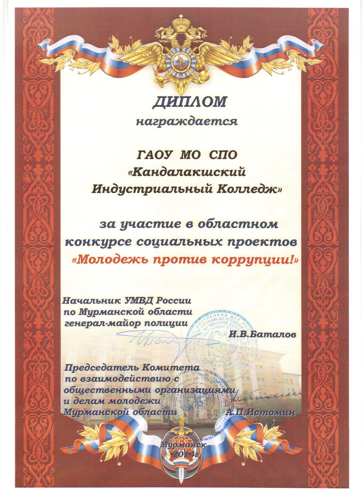 В феврале 2014 года студенты колледжа Афонина А., Баталов А., Макаркин В., Новожилова К. под руководством Зелинской А.И. приняли участие в областном конкурсе социальных проектов «Молодежь против коррупции», который проводился Управлением Министерства внутренних дел России по Мурманской области и Комитетом по взаимодействию с общественными организациями и делам молодежи Мурманской области.