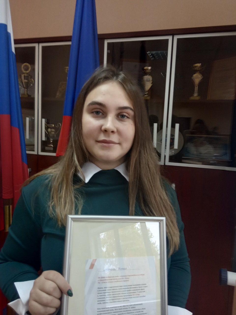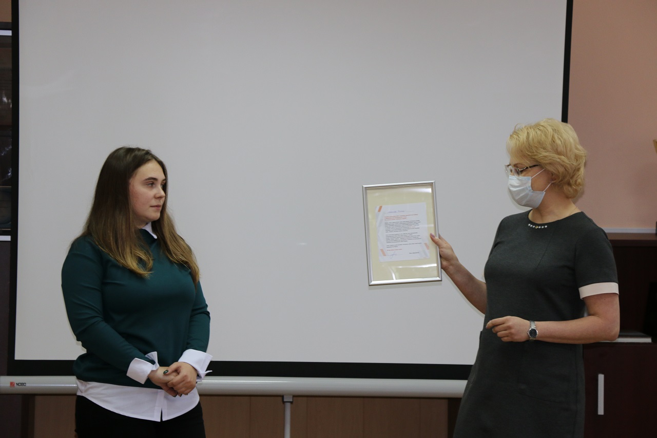 24 сентября в колледже состоялась церемония награждения, в которой приняли участие представители Кандалакшского алюминиевого завода: директор по персоналу Осташова Л.В., Ефимова С.В. и Иванова Е.В., которые поздравили Ксению и вручили ей памятные подарки.