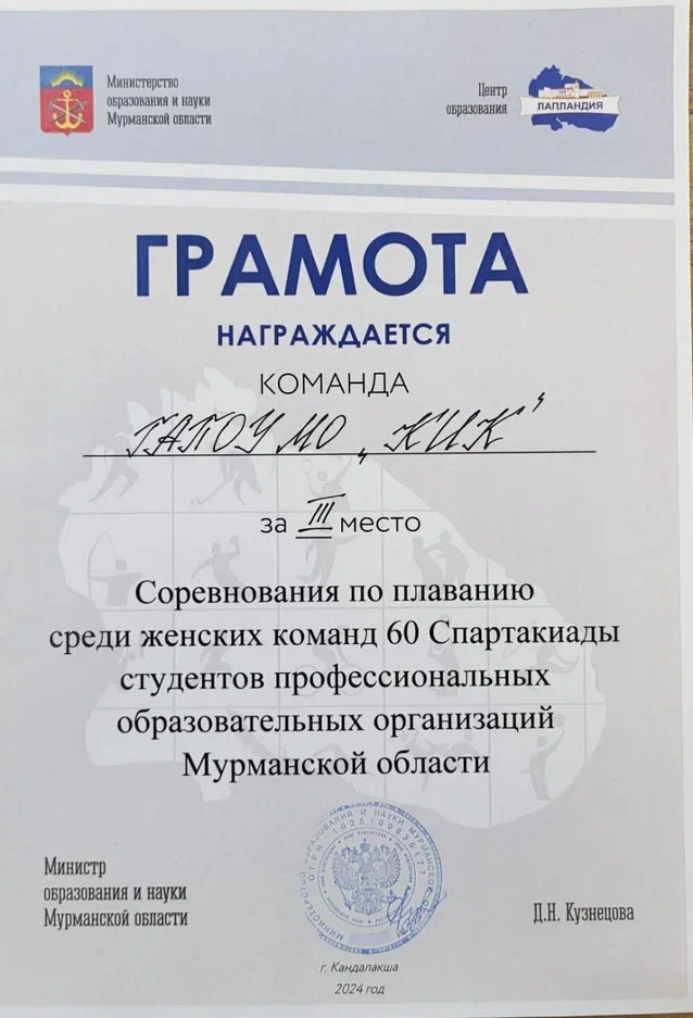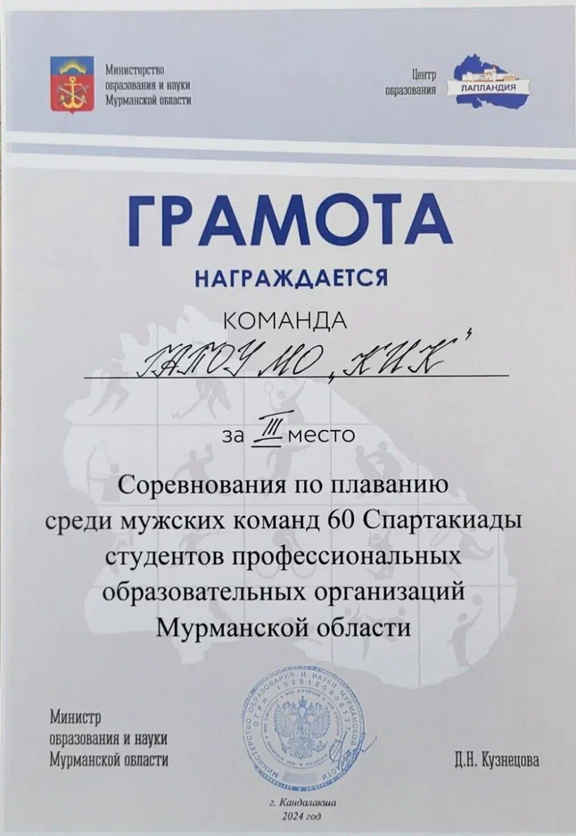 По итогам соревнований наши пловцы стали бронзовыми призерами. В составе команды Кандалакшского индустриального колледжа выступали студенты: