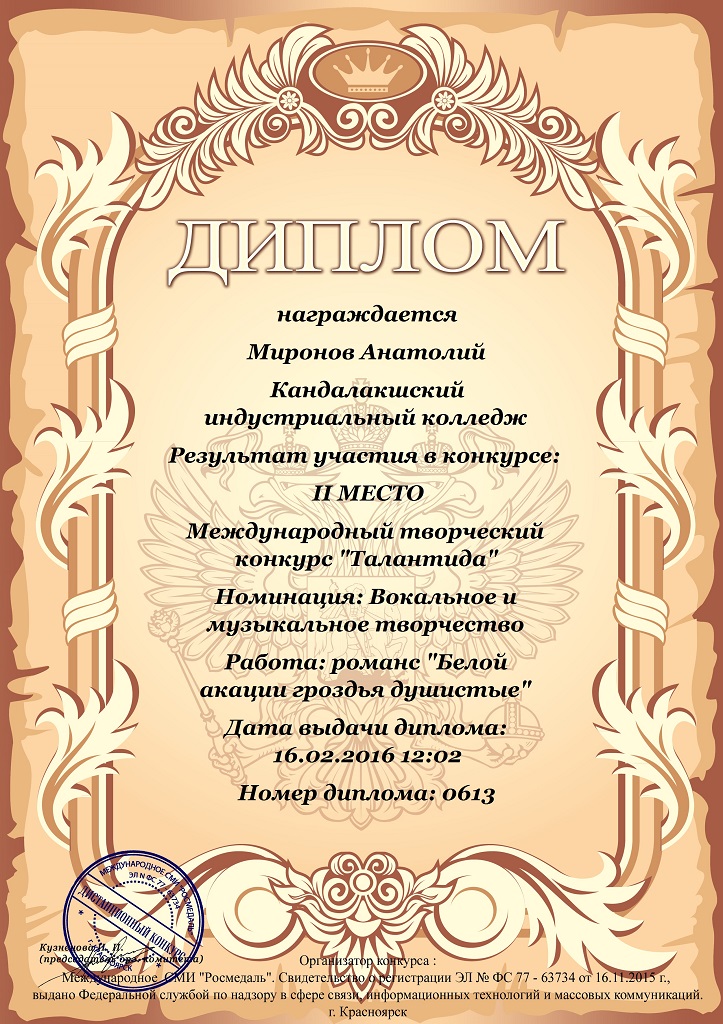 МИРОНОВ АНАТОЛИЙ, обучающийся 1 курса, группы № 172 занял 2 место в номинации «Вокальное и музыкальное творчество» с работой «Белой акации гроздья душистые».