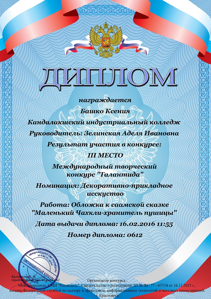 БАШКО КСЕНИЯ, обучающая 1 курса, группы № 172 заняла 3 место в номинации «Декоративно-прикладное исскуство» с работой «Обложка к саамской сказке «Маленький Чахкли – хранитель пушицы».