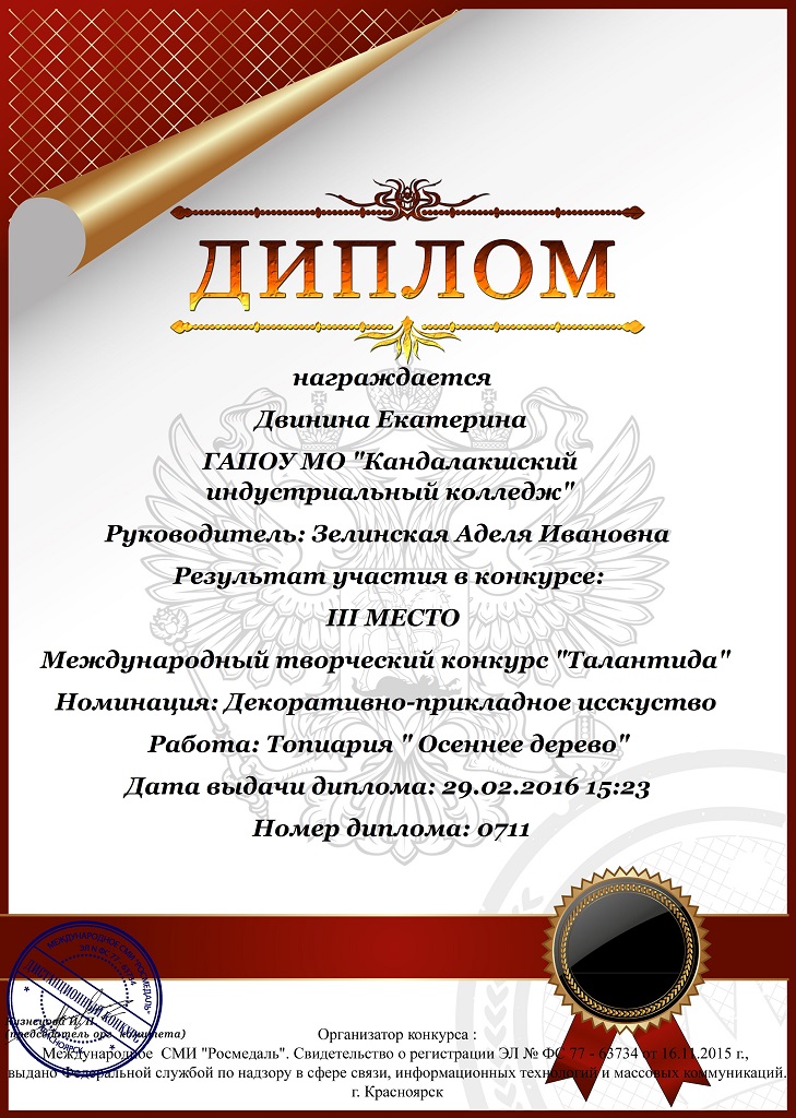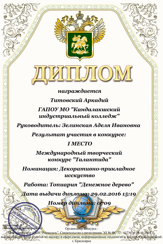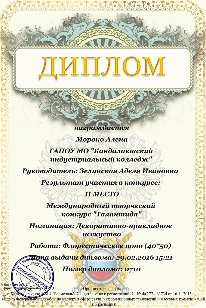 20 февраля творческие студенты группы 380: Двинина Екатерина, Мороко Алёна, Титовский Аркадий приняли участие в Международном конкурсе "Талантида" в номинации декоративно-прикладное творчество.