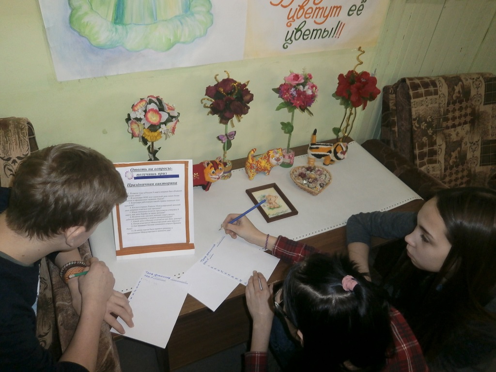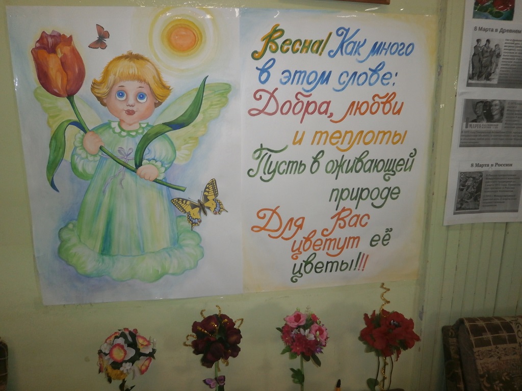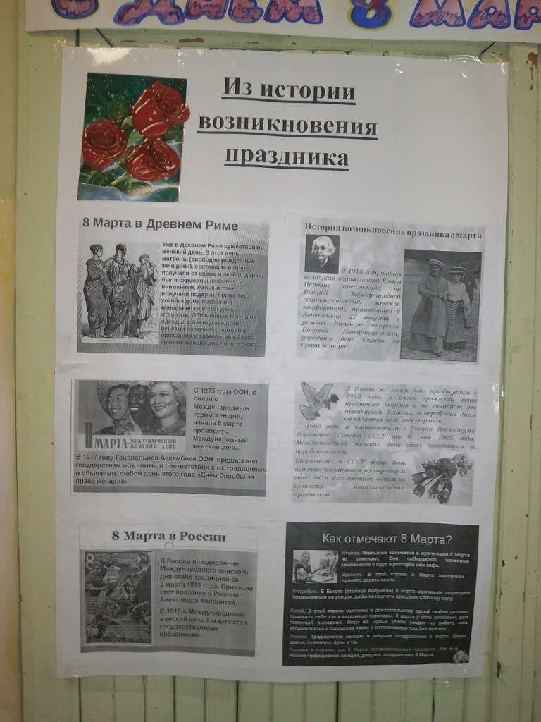 5 марта в помещении общежития студентами организован праздничный уголок - поздравление всем милым женщинам и девушкам с праздником 8 Марта. Ребятами представлены сувениры, поздравительные плакаты, а также познавательный плакат "Об истории возникновения праздника" , познавательная викторина с призами, которую подготовила библиотекарь колледжа Кривошеева Я.Н.
