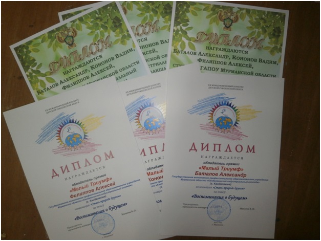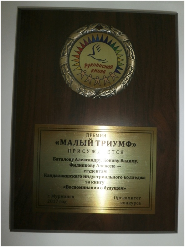Обучающиеся колледжа: Баталов Александр, Кононов Вадим, Филиппов Алексей заняли I место в номинации «Стань природе другом» и стали обладателями Главного приза – литературной премии «Малый Триумф» за книгу «Воспоминания о будущем».