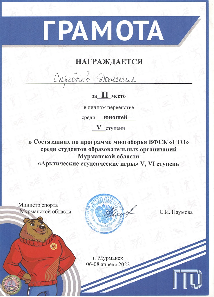 Наш обучающийся Скребков Даниил стал вторым в Арктических студенческих играх V ступени, а также занял