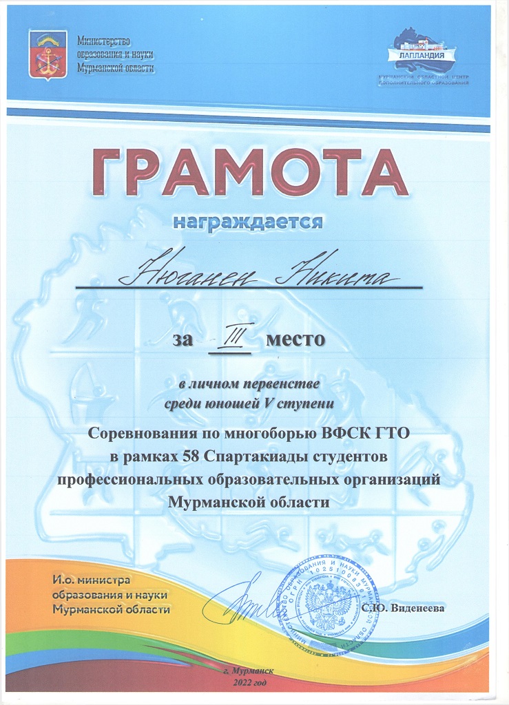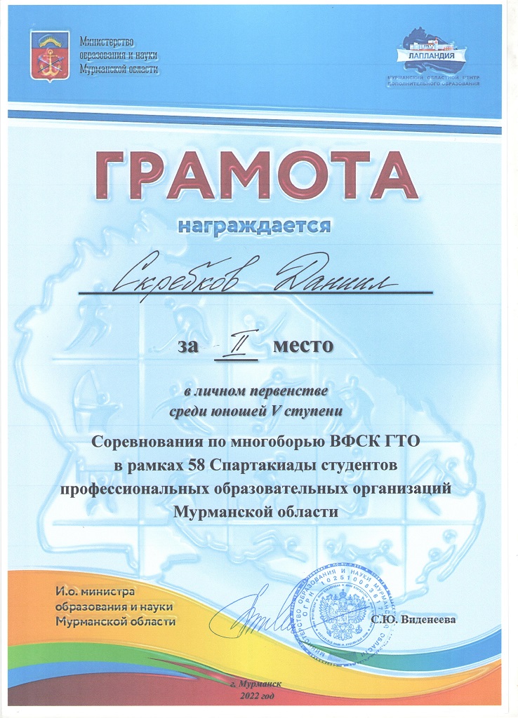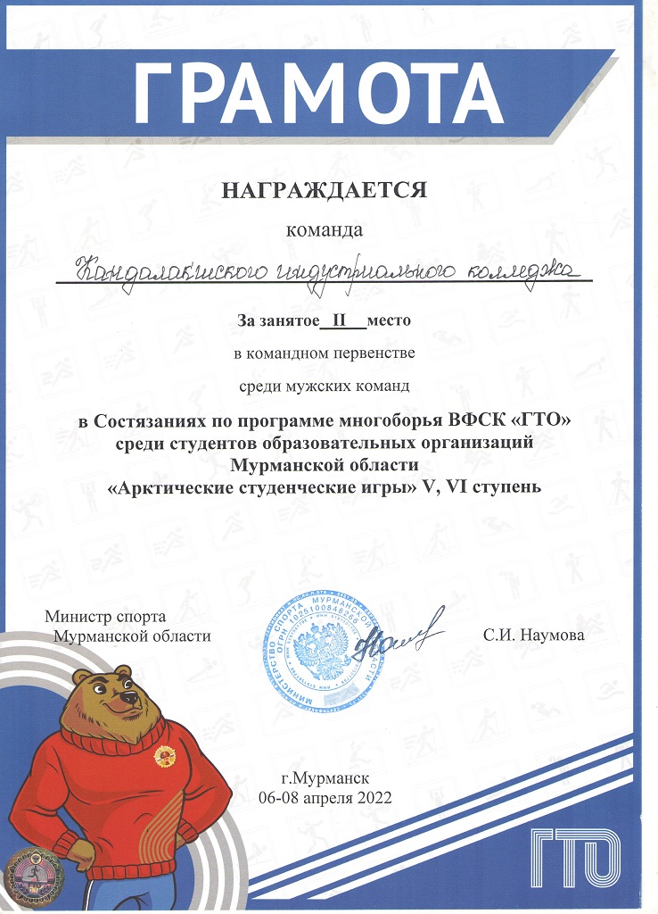 С 6 по 8 апреля 2022 года в столице Заполярья г. Мурманске прошли соревнования по программе многоборья ВФСК ГТО среди студентов образовательных организаций Мурманской области «Арктические студенческие игры» (V, VI ступень), областные соревнования по многоборью ВФСК ГТО и легкоатлетическому двоеборью в рамках 58-й Спартакиады студентов ПОО вторая группа. В них приняли участие 118 спортсменов.