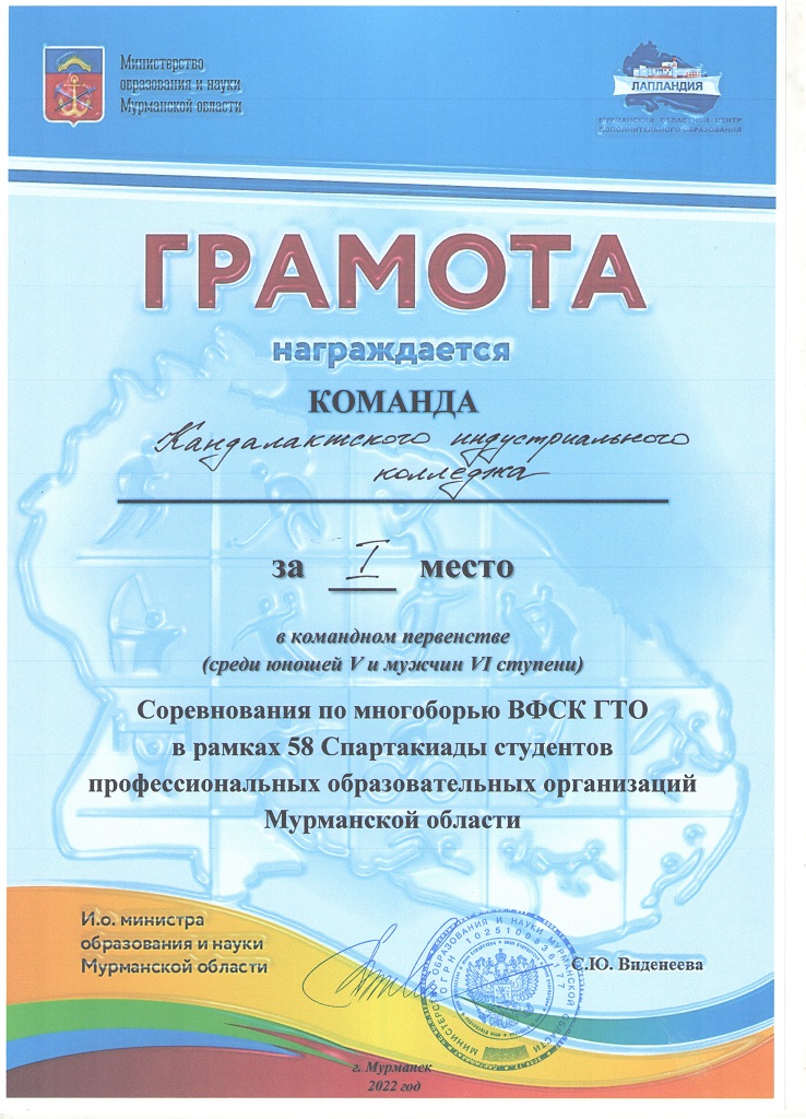 Наша команда юношей проявила морально волевые качества и в упорнейшей борьбе заняла первое общекомандное место по многоборью ВФСК ГТО и легкоатлетическому двоеборью и второе общекомандное место в Арктических студенческих играх , а сборная девушек завоевала первое общекомандное место по многоборью ВФСК ГТО, и второе место по легкоатлетическому двоеборью 58 спартакиаде студентов ПОО.