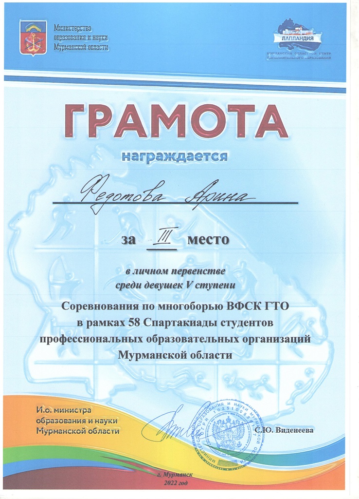 Федотова Арина заняла третье место лично по многоборью ВФСК ГТО 58 Спартакиады студентов ПОО
