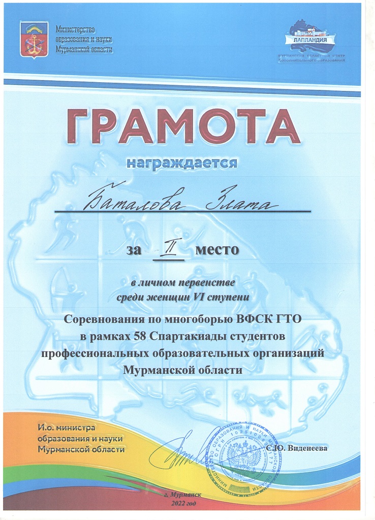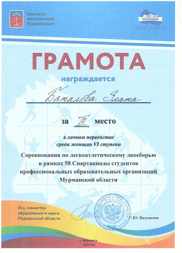 Баталова Злата заняла II личное место по многоборью ВФСК ГТО 58 Спартакиады студентов ПОО и третье лично по легкоатлетическому двоеборью