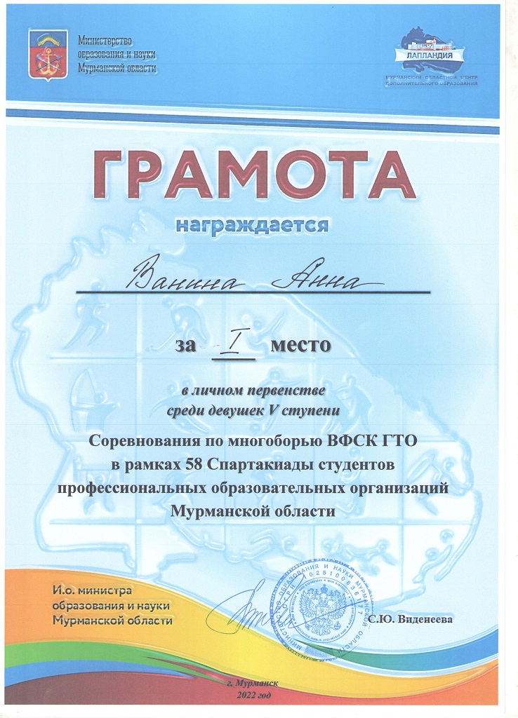 Ванина Анна заняла I личное место по многоборью ВФСК ГТО и легкоатлетическом двоеборье 58 Спартакиады студентов ПОО