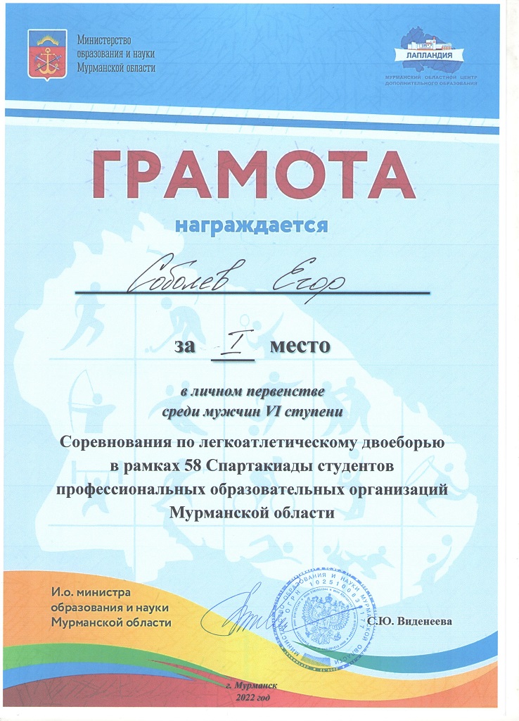 Соболев Егор занял I личное место по легкоатлетическому двоеборью 58 Спартакиады студентов ПОО .
