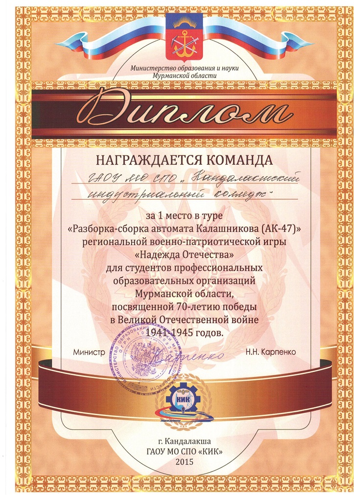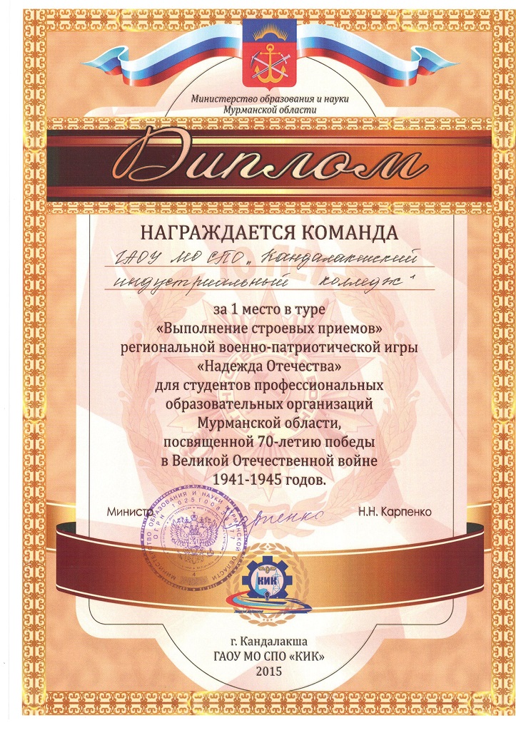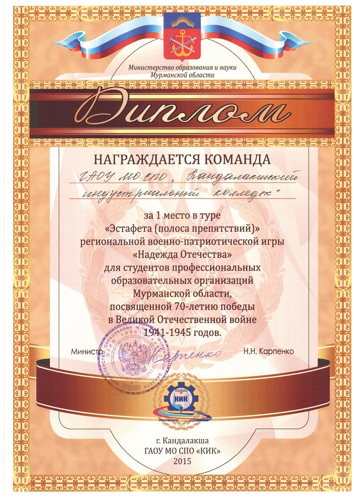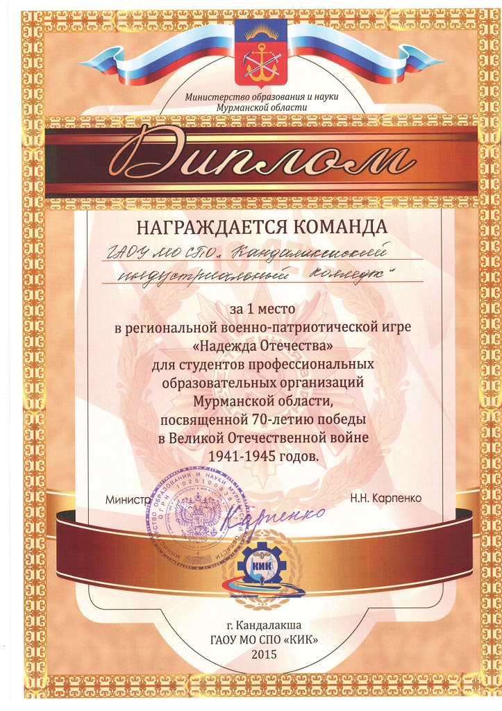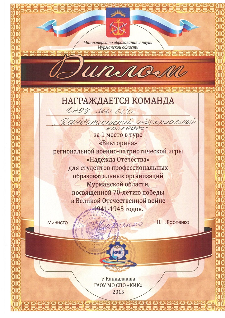 Победители награждены дипломами, подарками. Команде Кандалакшского индустриального колледжа вручен переходящий кубок «Надежда Отечества». Все остальные