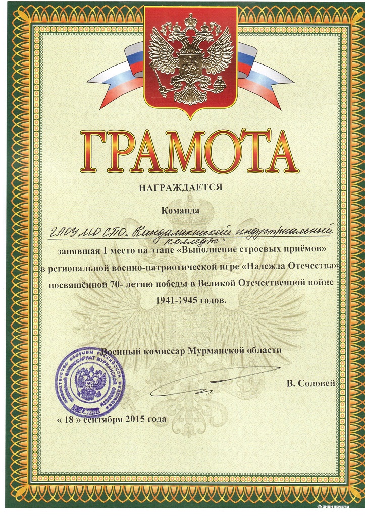 Строки этого стихотворения стали своеобразным девизом 5-й региональной военно- патриотической игры «Надежда Отечества» среди студентов образовательных учреждений среднего профессионального образования Мурманской области, посвящённой 70-летию Победы в Великой Отечественной войне, которая состоялась 18 сентября 2015г. на базе нашего колледжа.
