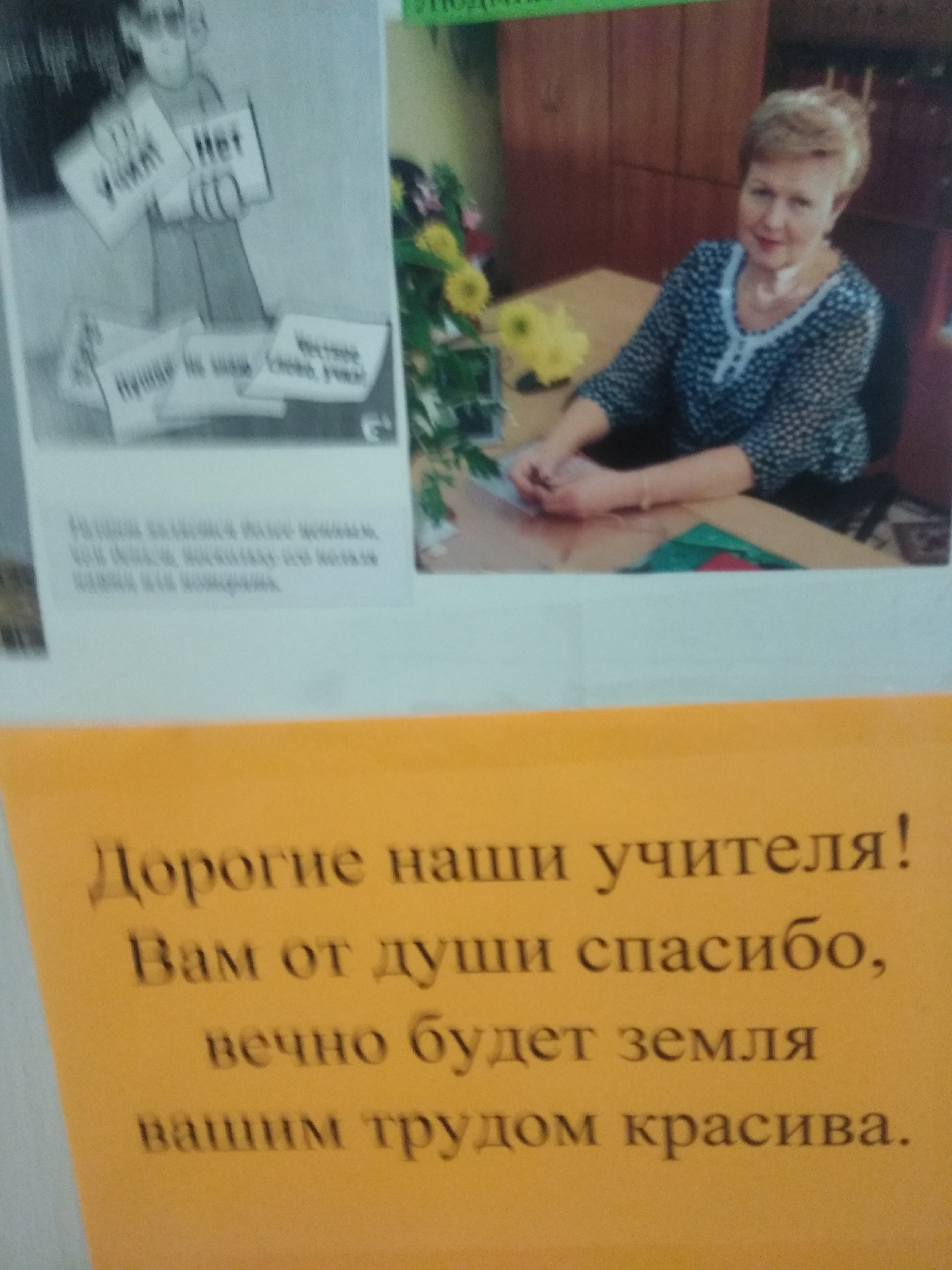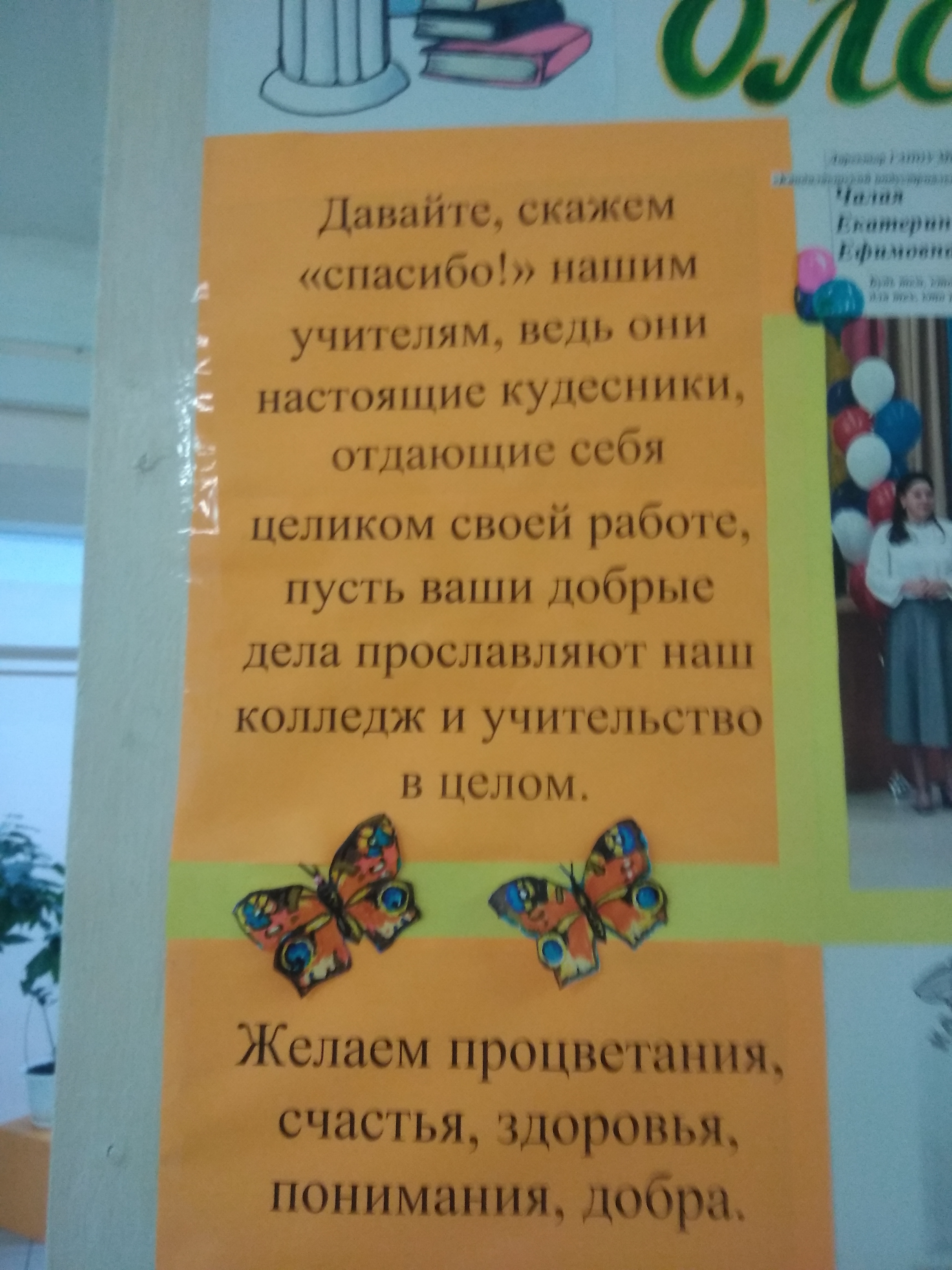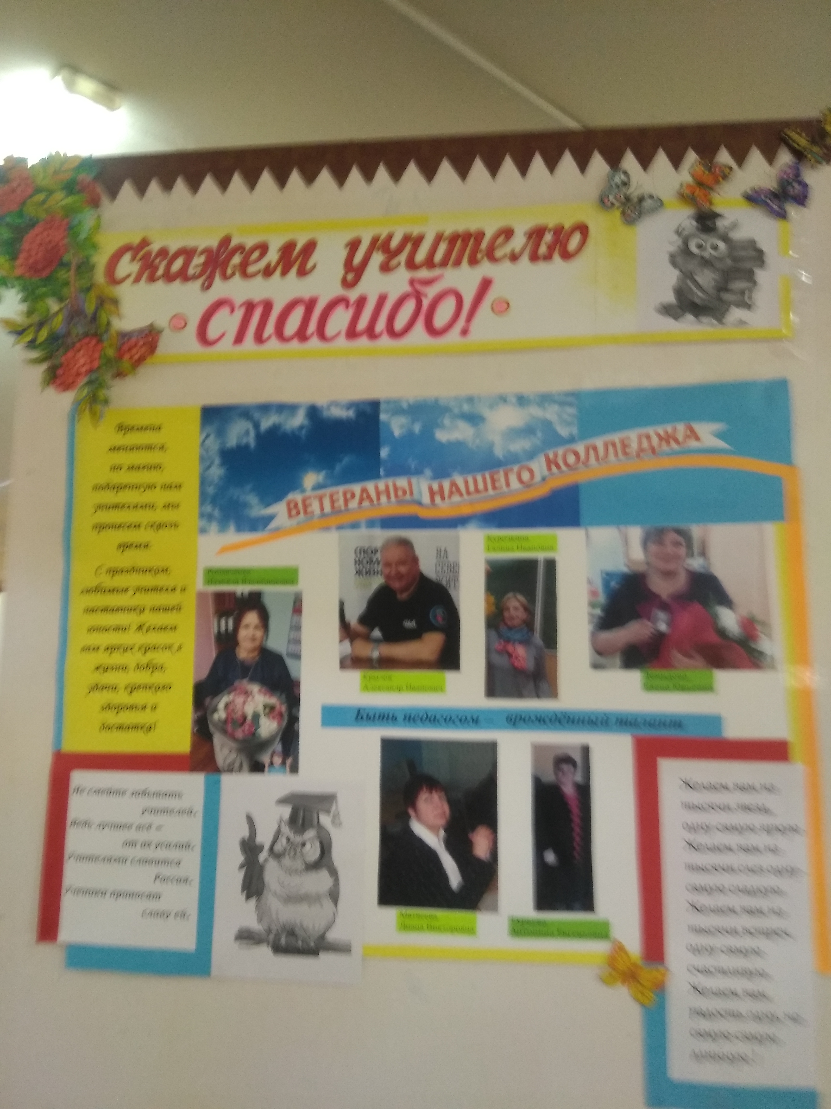 Творческая группа обучающихся – это Белов Иван, Ленинградская Варвара, Шелудько Арсений, Ермолин Максим, Севостьянов Алексей, Пушкарева Юлия, Морозова Татьяна, Николаева Милана, Макеева Анастасия - от имени всех учащихся колледжа поздравили педагогов с профессиональным праздником - Днём учителя. Ребята выполнили стенд по темам: «Страницы истории», «Скажи учителю «спасибо», «Уважаемые, любимые учителя, мы вам благодарны». Педагог дополнительного образования Зелинская А. И. подготовила к празднику небольшой вернисаж своих творческих работ и фотостенд «Цветы для вас». Библиотекарь Забудько О. А. помогла составить текст поздравлений. В рекреациях колледжа стало празднично, ярко, красиво и тепло от добрых слов благодарности и поздравлений.