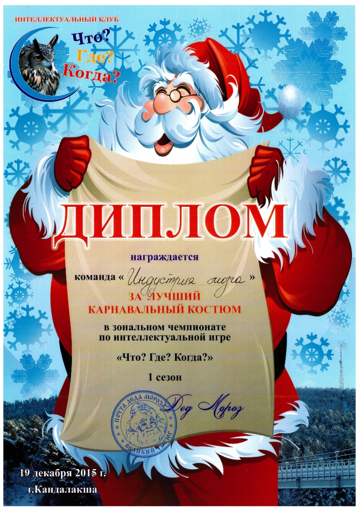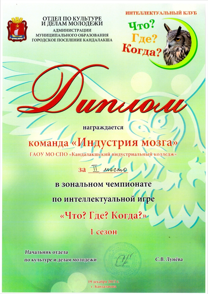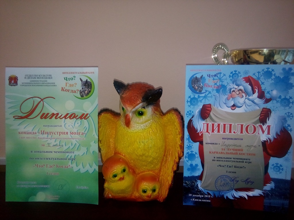 19 декабря 2015 года в ДЮЦ "Ровесник" состоялась финальная игра первого сезона зонального чемпионата по интеллектуальной игре "Что?Где?Когда?". По итогам трех прошедших игр команда Кандалакшского индустриального колледжа "Индустрия мозга" заняла почетное второе место, а также победила в номинации "За лучший карнавальный костюм".