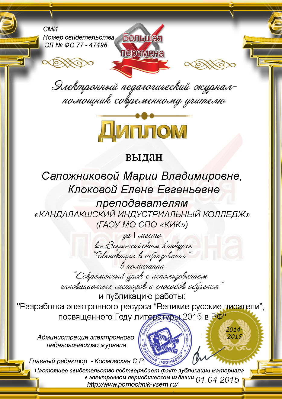 В апреле 2015 г. преподаватели ГАОУ МО СПО «Кандалакшский индустриальный колледж» Клокова Е.Е. и Сапожникова М.В. приняли участие во Всероссийском конкурсе «Инновации в образовании» в номинации «Современный урок с использованием инновационных методов и способов обучения», который проводился в рамках электронного педагогического журнала.