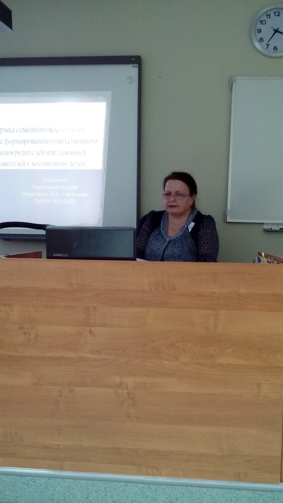 Наш колледж представляла социальный педагог Романченко Надежда Владимировна, которая выступила и поделилась опытом работы по теме: «Взаимодействие образовательной организации и семьи по созданию культурно – образовательного пространства».