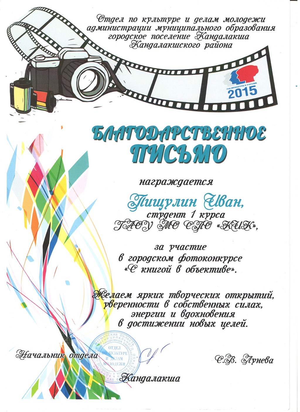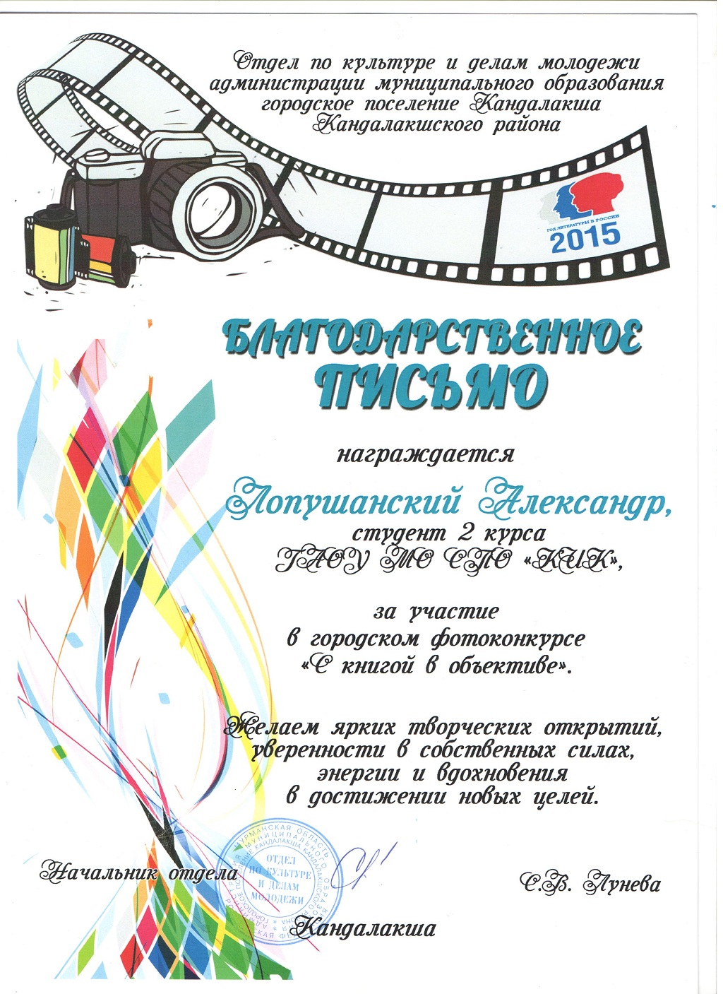 7 февраля 2015 года студенты колледжа Лопушанский Александр и Пищулин Иван приняли участие в городском фотоконкурсе "С книгой в объективе". На конкурс ребята представили 6 работ (размером 30x20). За участие в конкурсе обучающиеся награждены Благодарственным письмом отдела по культуре и делам молодёжи администрации муниципального образования городское поселение Кандалакша Кандалакшского района.