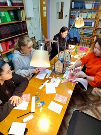 Студенты колледжа совместно с советником директора по воспитанию, Ириной Вячеславовной, специалистом библиотеки Ольгой Александровной, а также воспитателями общежития Ириной Александровной и Светланой Владимировной подготовили новогодние открытки для военнослужащих, участвующих в специальной военной операции.