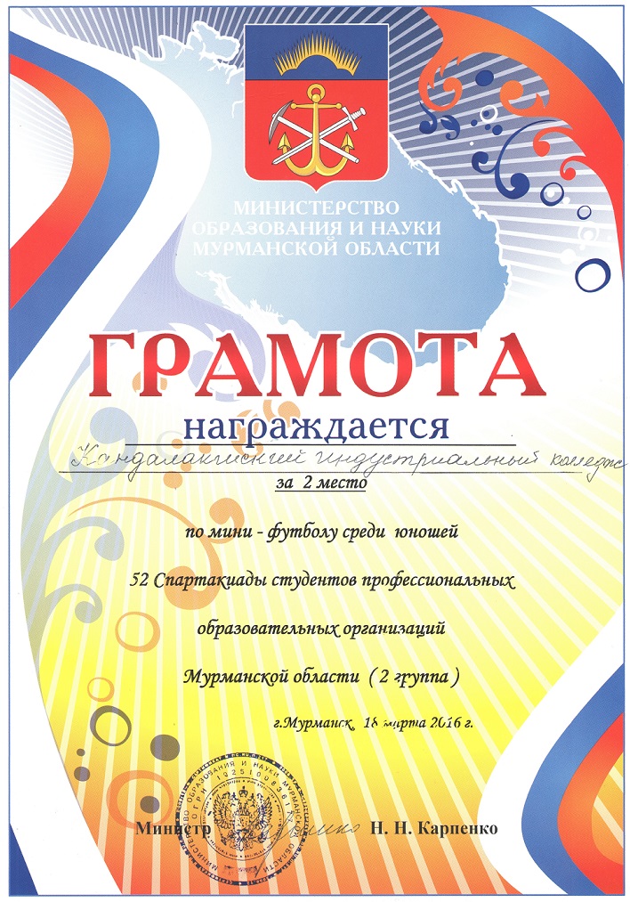 18 марта сборная команда нашего колледжа по мини-футболу приняла участие в финальных играх 52 –й спартакиады студентов профессиональных образовательных организаций Мурманской области в городе Мурманске на спортивной арене ГОУ ДОД МОЦДОД «Лапландия». В упорной и вязкой игре с сильнейшими сборными колледжей Кольского полуострова удалось завоевать второе место, кубок и грамоту министерства образования и науки Мурманской области.