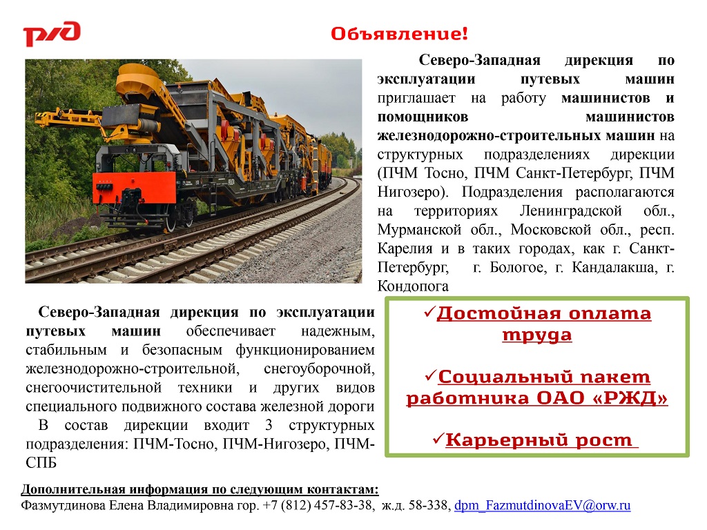 Северо-Западная дирекция по эксплуатации путевых машин приглашает на работу машинистов и помощников машинистов железнодорожно-строительных машин
