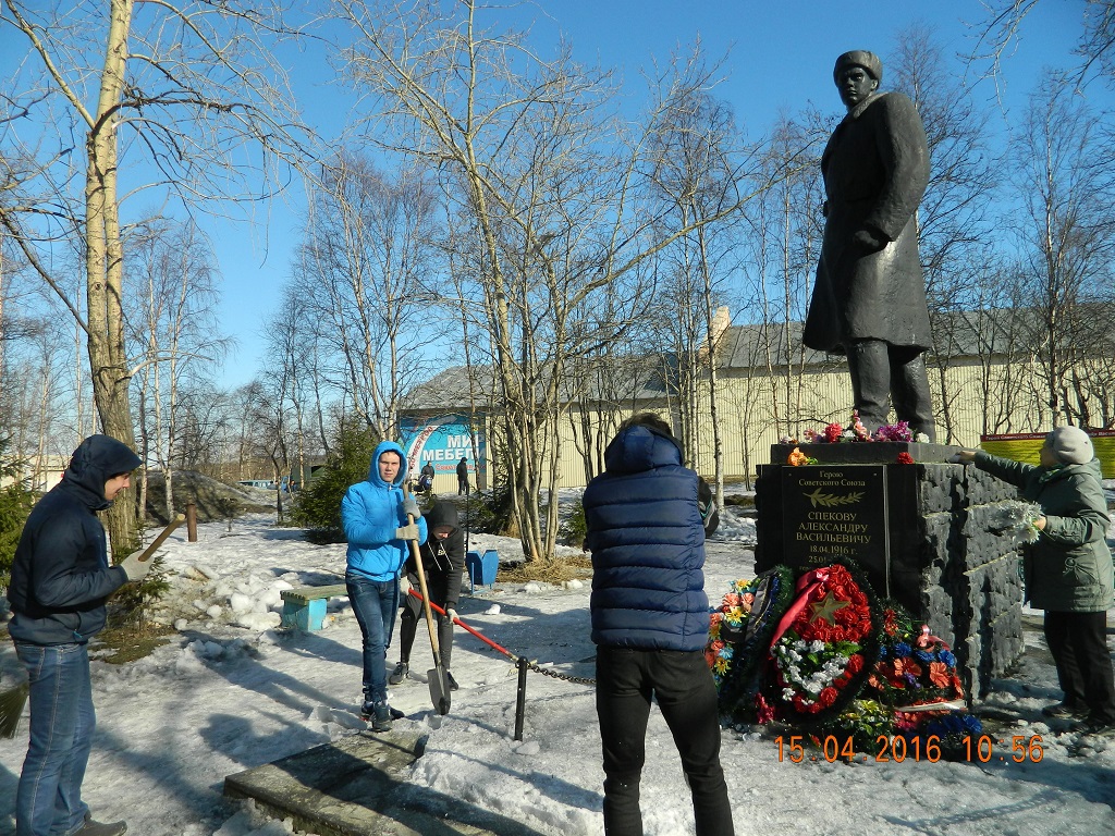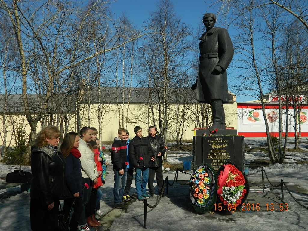 Перед молодежью выступили глава городского поселения Кандалакша Павлов М.С., краевед Зяблов В.В., председатель «Совета ветеранов войны и труда Локомотивного депо» Хартикайнен В.А., которые рассказали присутствующим о подвиге А.В. Спекова, о мужестве и героизме, проявленные им в боях с белофиннами. В конце мероприятия к памятнику А.В. Спекова были возложены цветы.