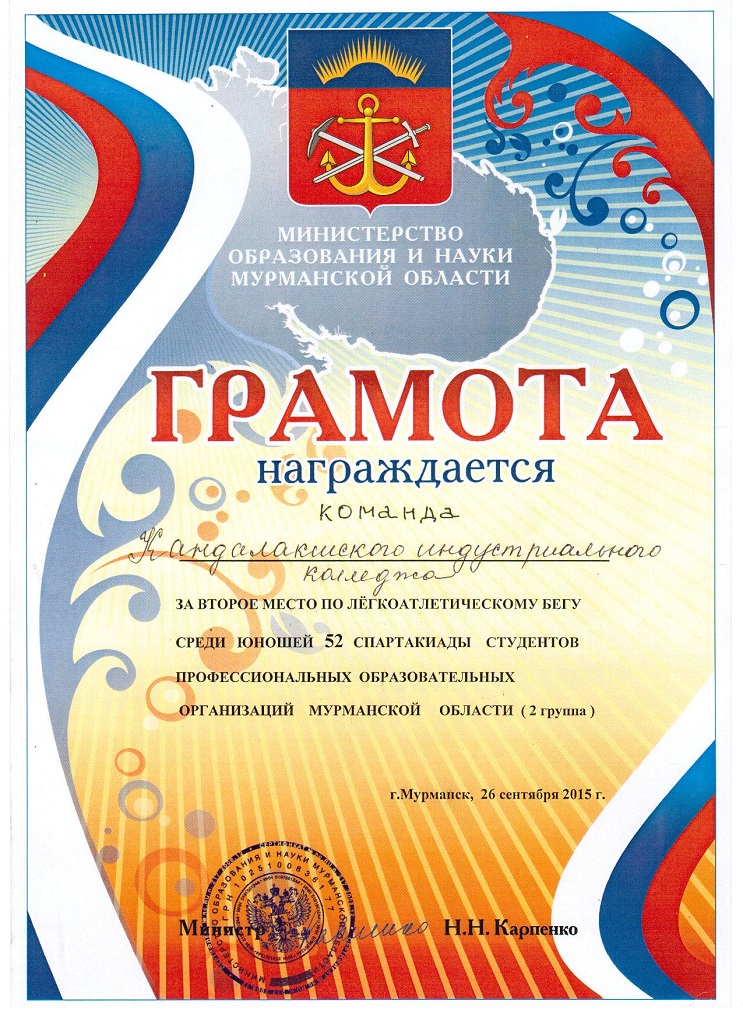 26 сентября в городе Мурманске сборная команда колледжа выступала на 52 спартакиаде студентов профессиональных образовательных организаций Мурманской области во второй группе по легкоатлетическому бегу среди юношей, на дистанции 1000 метров.