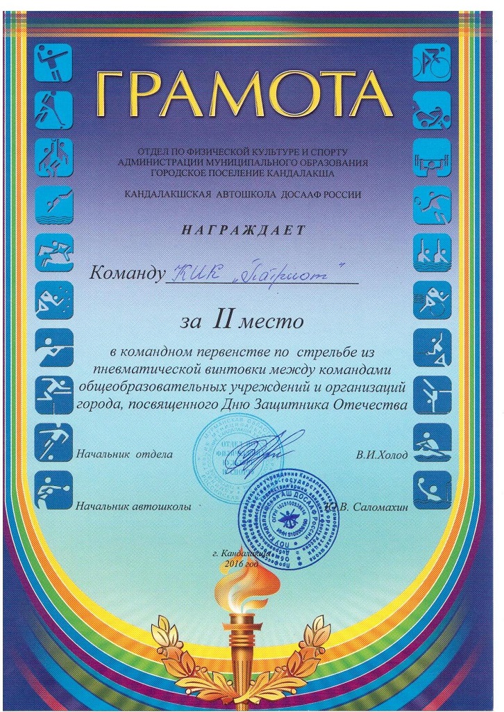 В соответствии с планом мероприятий военно-патриотического воспитания обучающихся ГАПОУ МО «Кандалакшский индустриальный колледж» на 2015/2016 учебный год, в целях популяризации стрелкового вида спорта, повышения спортивного мастерства среди обучающихся колледжа, 18 февраля 2016 года команда колледжа приняла участие в лично – командном первенстве по стрельбе из пневматической винтовки между командами образовательных учреждений и организаций города Кандалакша, посвященному Дню Защитника Отечества. Соревнование проводилось на базе Кандалакшской автомобильной школы ДОСААФ России.