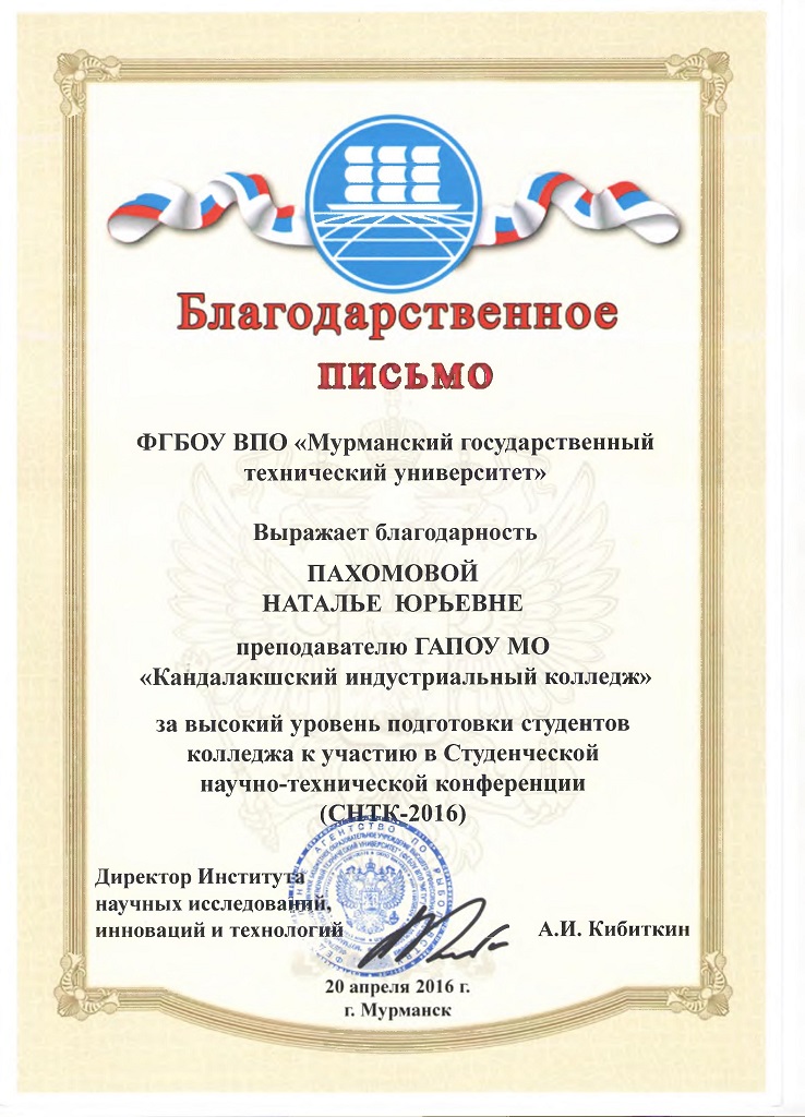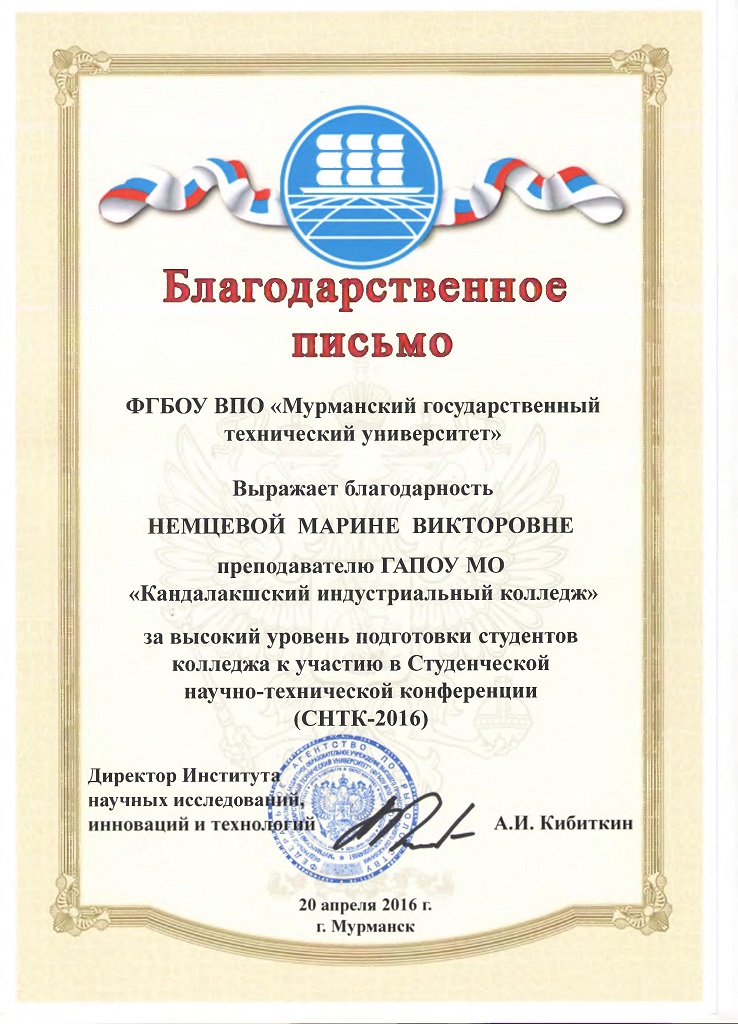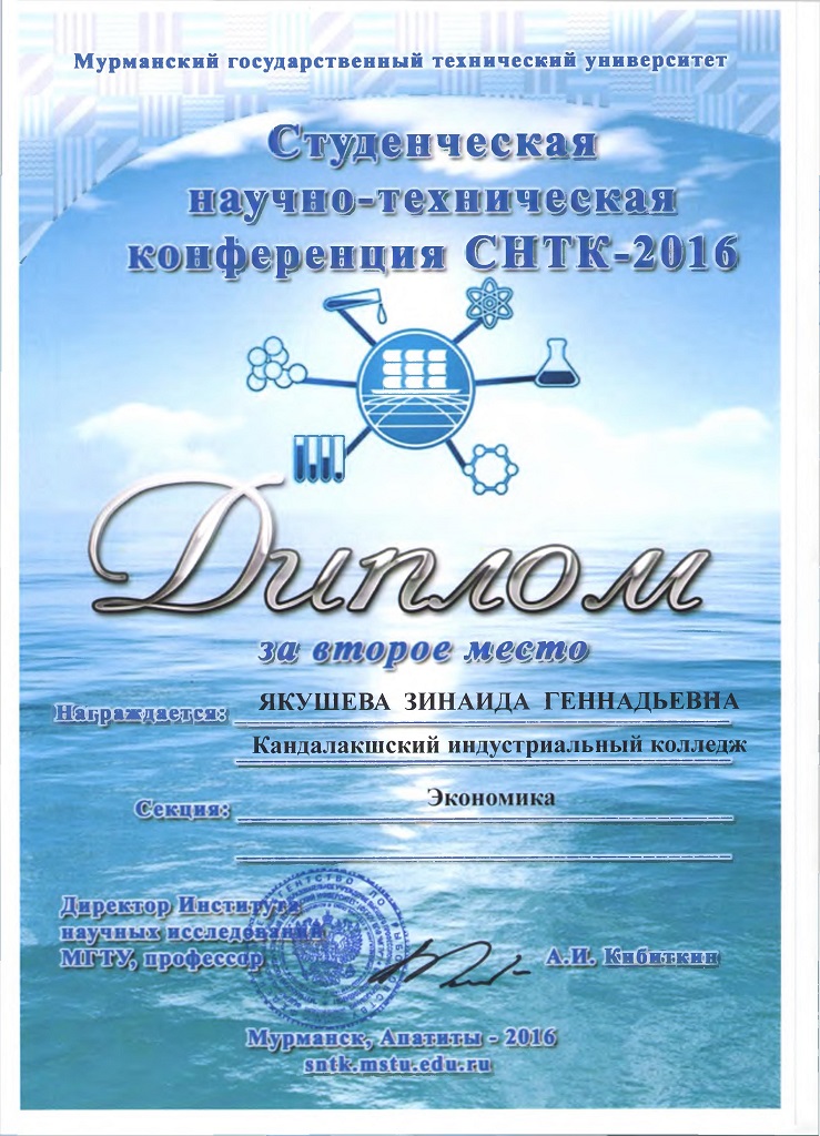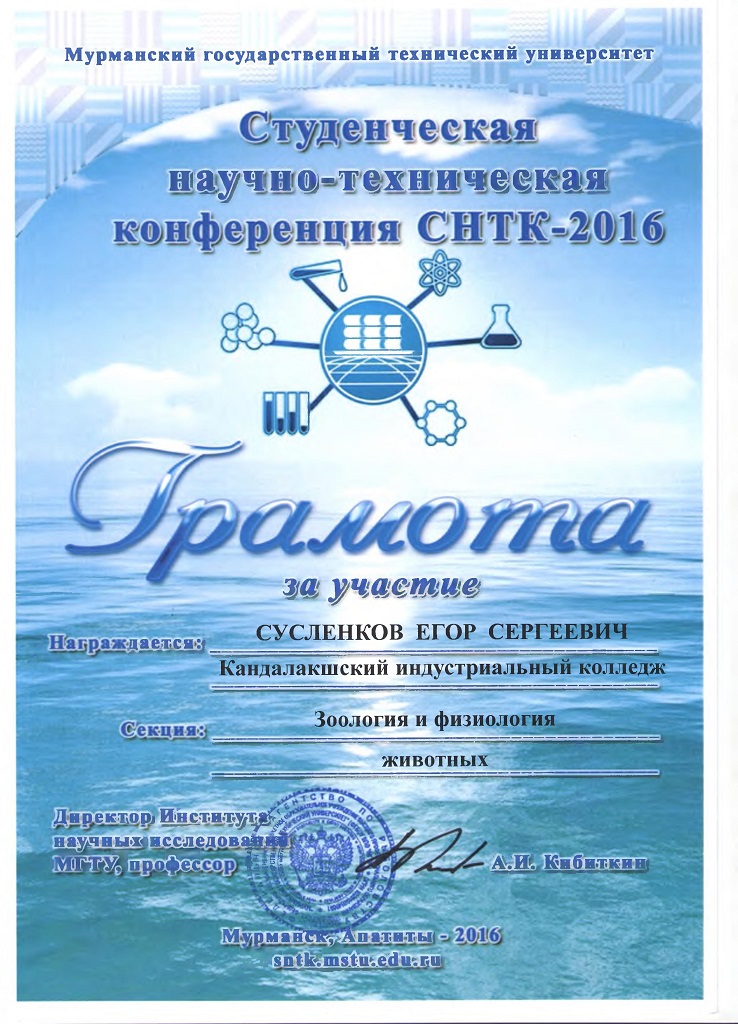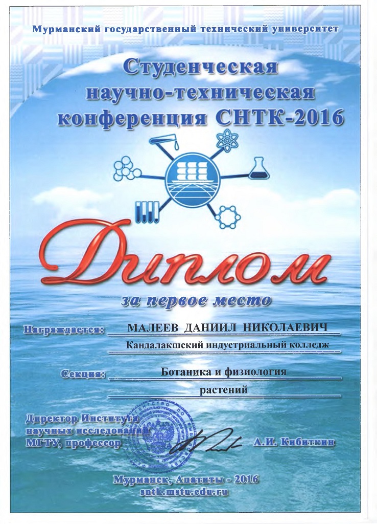 20 апреля 2016 года студенты ГАПОУ МО «Кандалакшский индустриальный колледж» приняли участие в студенческой научно – технической конференции МГТУ «СНТК-2016». Всего на 49 научных секциях было представлено 727 докладов. От колледжа в конференции приняли участие 3 человека. Направления работ разнообразны: ботаника и физиология растений, зоология и физиология животных, иностранный язык в экономике. Все проекты отличались актуальностью, самостоятельностью и творческим подходом. Победителями и призерами в своих номинациях стали: • Якушева Зинаида - диплом 2 степени (руководитель Пахомова Н.Ю.); • Малеев Даниил – диплом 1 степени (руководитель Немцева М.В.). По итогам СНТК-2016 будет издан сборник лучших материалов конференции, в который войдут и работы Кандалакшских студентов.