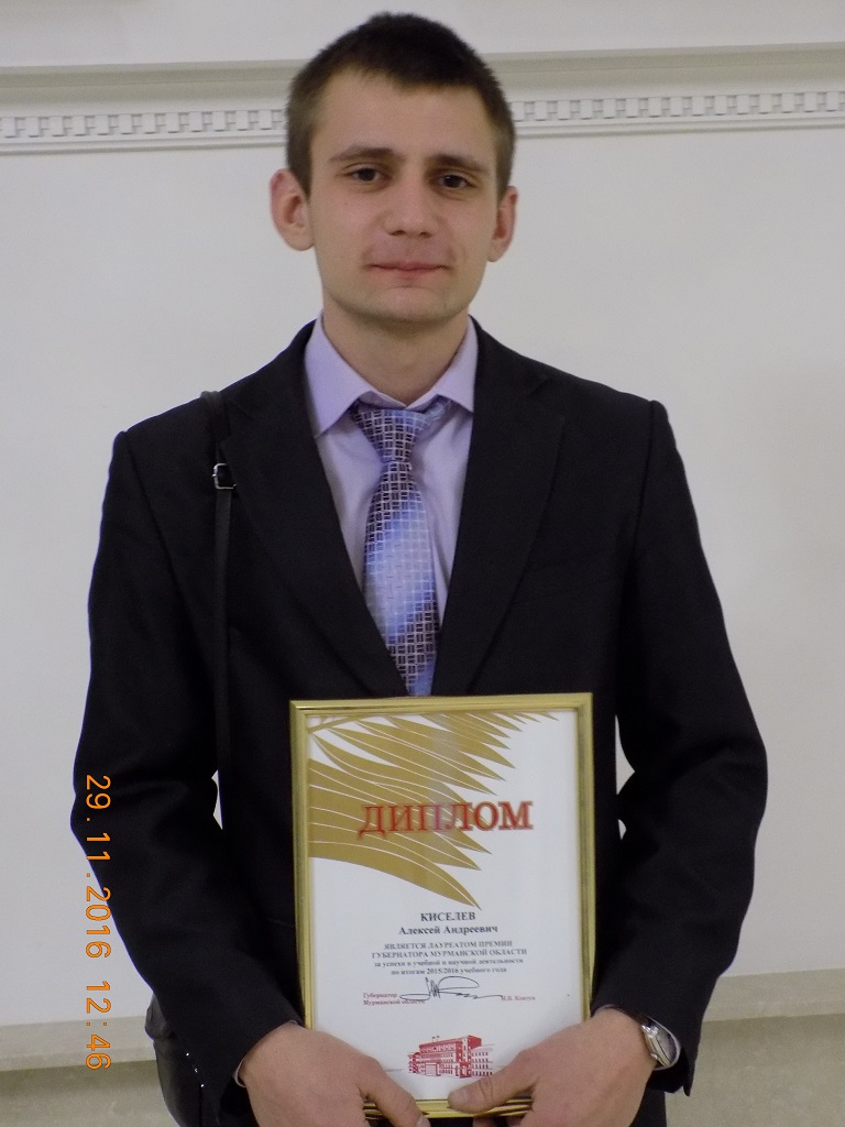 В этом году по результатам конкурсного отбора среди студентов ГАПОУ МО «Кандалакшский индустриальный колледж» на получение премии Губернатора Мурманской области были выдвинуты кандидатуры Киселева Алексея Андреевича, студента группы № 340 по специальности «Электроснабжение (по отраслям)» в номинации « За успехи в учебной и научной деятельности» и Зырянова Александра Романовича, студента группы №340 по специальности «Электроснабжение (по отраслям)» в номинации «За успехи в спортивной деятельности».