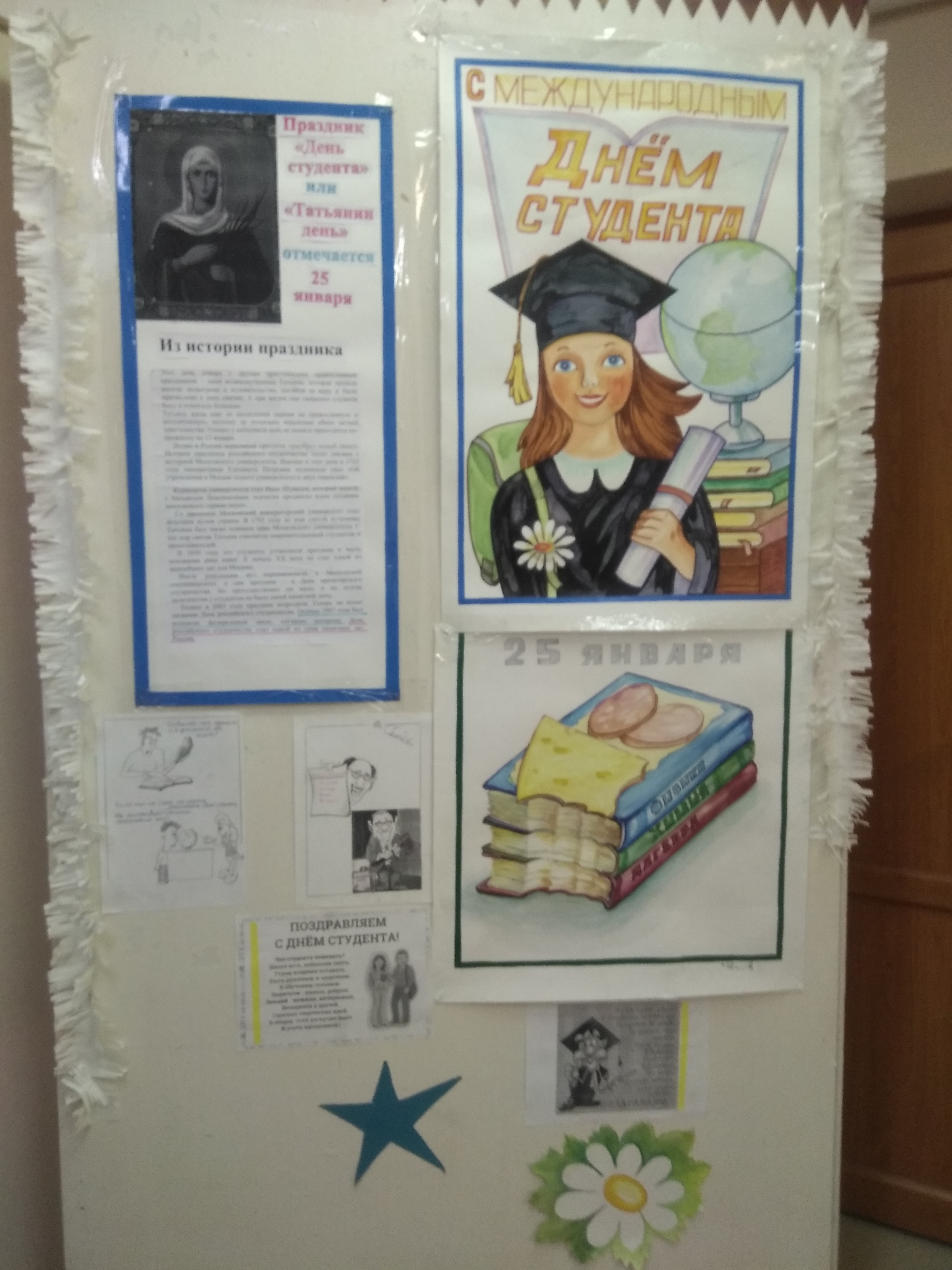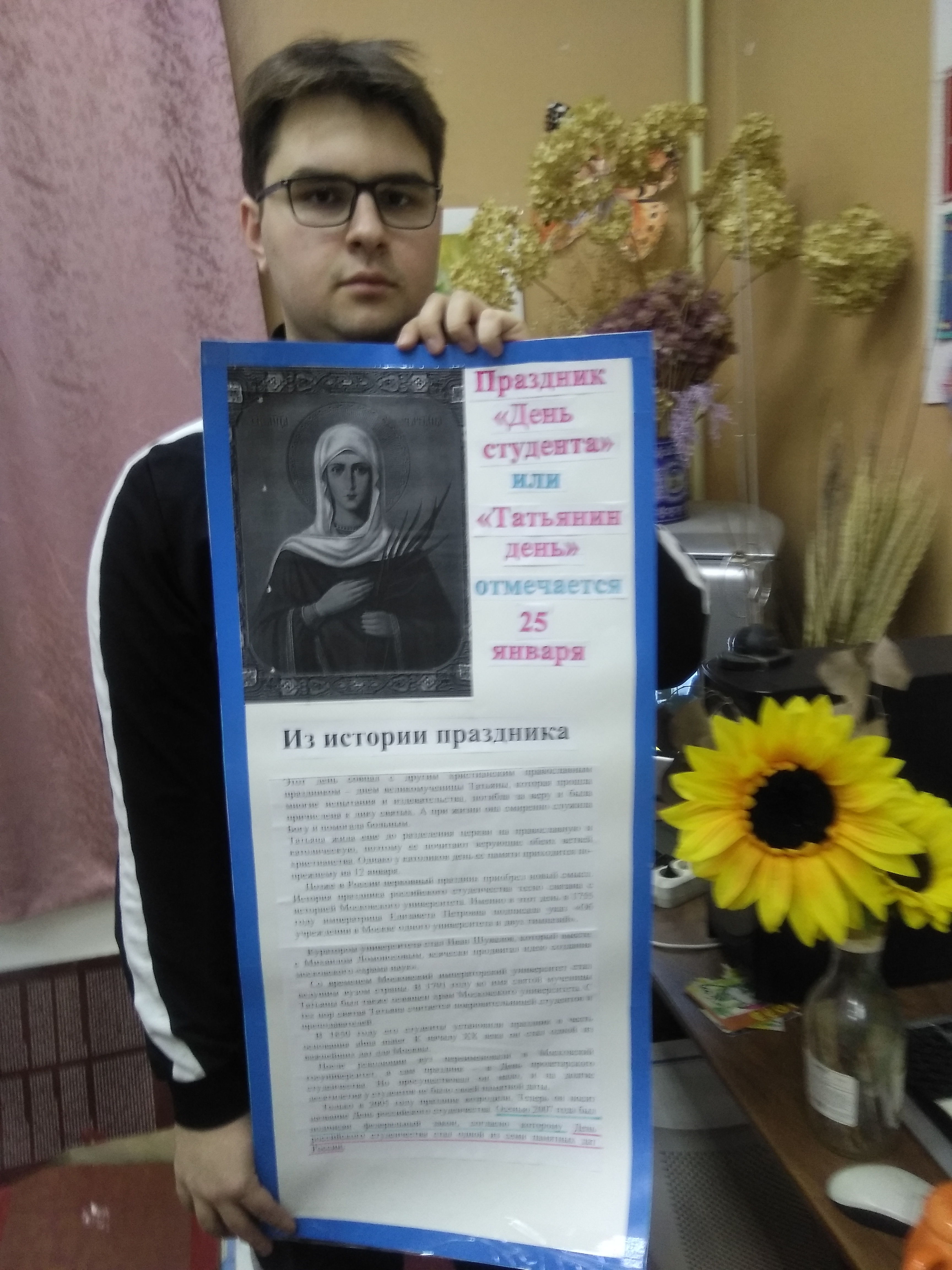 В конце января, по доброй традиции, сложившейся ещё в XVIII веке, отмечают Татьянин день – традиционный студенческий праздник или День студента. Как он появился и какие народные традиции связаны с ним? Как отмечали Татьянин день раньше и как празднуют сейчас. Историю праздника нам поведал в своем информационном плакате Шангин Алексей, участник творческой мастерской. Он и другие ребята поздравили всех студентов и преподавателей колледжа красочными плакатами и «телеграммами».