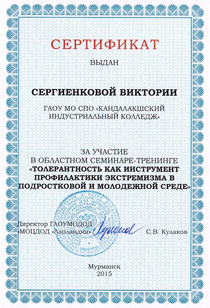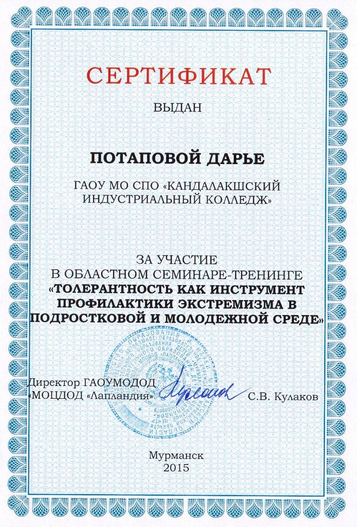В ходе реализации Комплекса мер по предупреждению межнациональных конфликтов, противодействию этнической и религиозной нетерпимости, ксенофобии и экстремистским проявлениям среди детей и молодёжи Мурманской области, в целях повышения профилактической работы по противодействию экстремизму среди обучающихся, студенты колледжа Сергиенкова Виктория и Потапова Дарья, а также социальный педагог Романченко Надежда Владимировна, приняли участие в областном семинаре «Толерантность как инструмент профилактики экстремизма в подростковой и молодёжной среде», который проходил 15 апреля 2015 года на базе ГАОУМО ДОД «МОЦДОД «Лапландия».